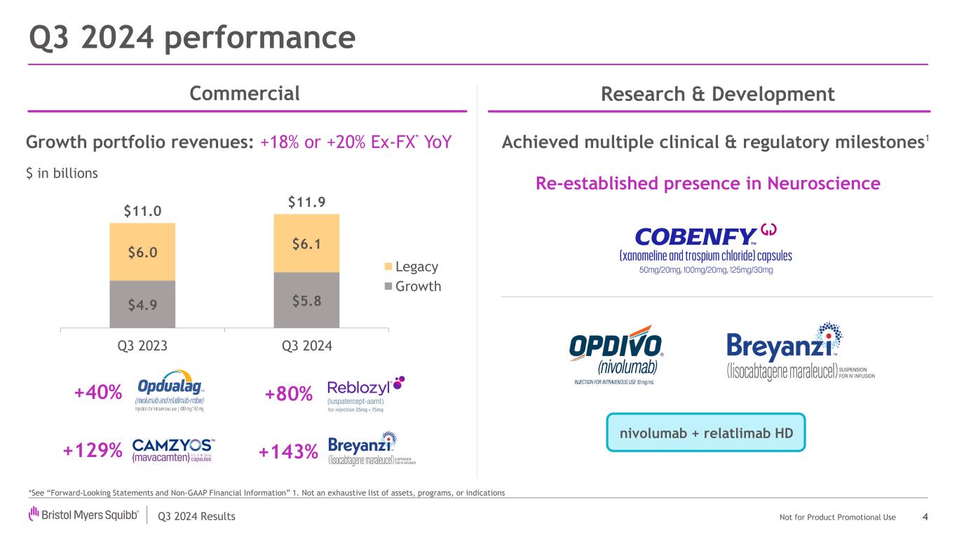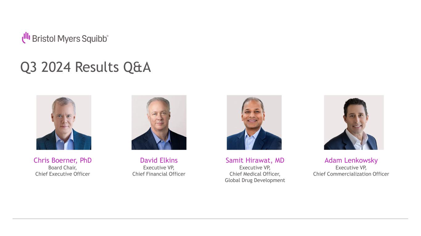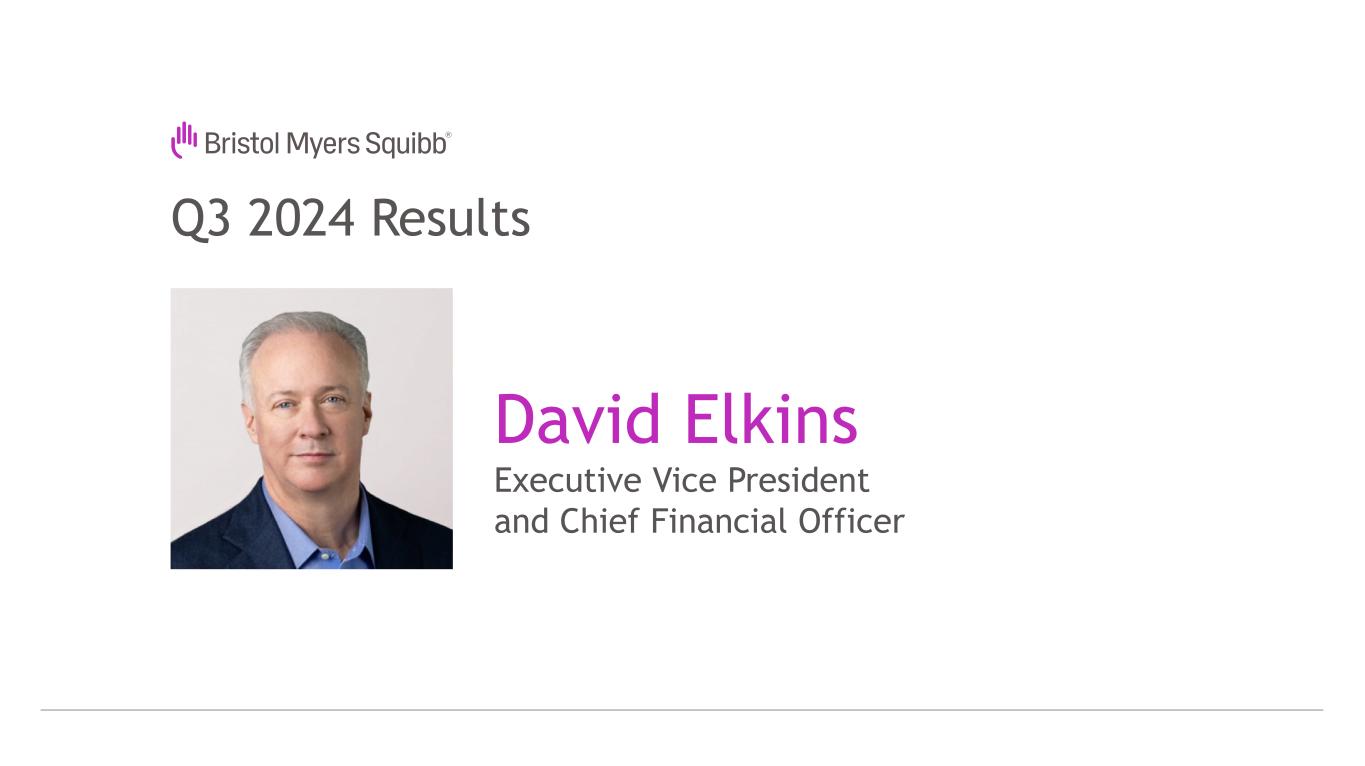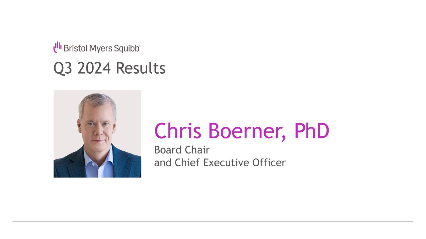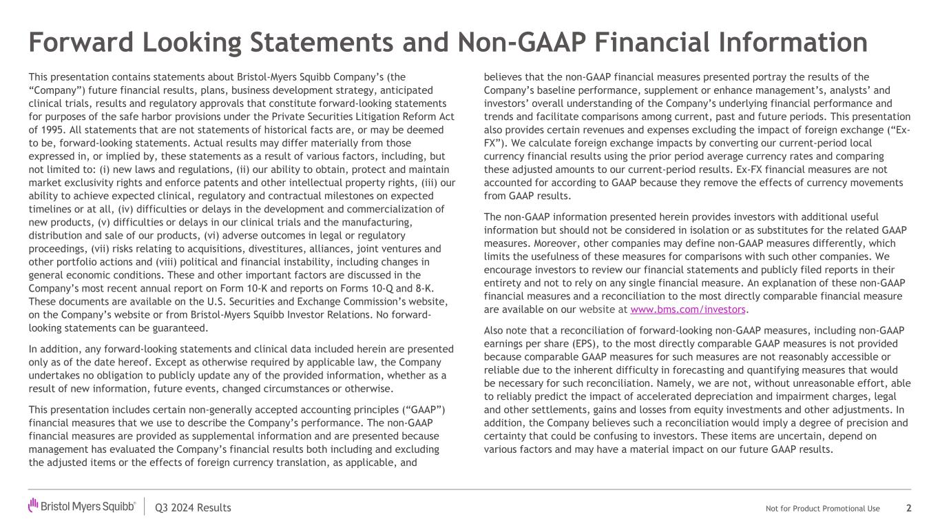 Not for Product Promotional UseQ3 2024 Results Forward Looking Statements and Non-GAAP Financial Information 2 This presentation contains statements about Bristol-Myers Squibb Company’s (the “Company”) future financial results, plans, business development strategy, anticipated clinical trials, results and regulatory approvals that constitute forward-looking statements for purposes of the safe harbor provisions under the Private Securities Litigation Reform Act of 1995. All statements that are not statements of historical facts are, or may be deemed to be, forward-looking statements. Actual results may differ materially from those expressed in, or implied by, these statements as a result of various factors, including, but not limited to: (i) new laws and regulations, (ii) our ability to obtain, protect and maintain market exclusivity rights and enforce patents and other intellectual property rights, (iii) our ability to achieve expected clinical, regulatory and contractual milestones on expected timelines or at all, (iv) difficulties or delays in the development and commercialization of new products, (v) difficulties or delays in our clinical trials and the manufacturing, distribution and sale of our products, (vi) adverse outcomes in legal or regulatory proceedings, (vii) risks relating to acquisitions, divestitures, alliances, joint ventures and other portfolio actions and (viii) political and financial instability, including changes in general economic conditions. These and other important factors are discussed in the Company’s most recent annual report on Form 10-K and reports on Forms 10-Q and 8-K. These documents are available on the U.S. Securities and Exchange Commission’s website, on the Company’s website or from Bristol-Myers Squibb Investor Relations. No forward- looking statements can be guaranteed. In addition, any forward-looking statements and clinical data included herein are presented only as of the date hereof. Except as otherwise required by applicable law, the Company undertakes no obligation to publicly update any of the provided information, whether as a result of new information, future events, changed circumstances or otherwise. This presentation includes certain non-generally accepted accounting principles (“GAAP”) financial measures that we use to describe the Company’s performance. The non-GAAP financial measures are provided as supplemental information and are presented because management has evaluated the Company’s financial results both including and excluding the adjusted items or the effects of foreign currency translation, as applicable, and believes that the non-GAAP financial measures presented portray the results of the Company’s baseline performance, supplement or enhance management’s, analysts’ and investors’ overall understanding of the Company’s underlying financial performance and trends and facilitate comparisons among current, past and future periods. This presentation also provides certain revenues and expenses excluding the impact of foreign exchange (“Ex- FX”). We calculate foreign exchange impacts by converting our current-period local currency financial results using the prior period average currency rates and comparing these adjusted amounts to our current-period results. Ex-FX financial measures are not accounted for according to GAAP because they remove the effects of currency movements from GAAP results. The non-GAAP information presented herein provides investors with additional useful information but should not be considered in isolation or as substitutes for the related GAAP measures. Moreover, other companies may define non-GAAP measures differently, which limits the usefulness of these measures for comparisons with such other companies. We encourage investors to review our financial statements and publicly filed reports in their entirety and not to rely on any single financial measure. An explanation of these non-GAAP financial measures and a reconciliation to the most directly comparable financial measure are available on our website at www.bms.com/investors. Also note that a reconciliation of forward-looking non-GAAP measures, including non-GAAP earnings per share (EPS), to the most directly comparable GAAP measures is not provided because comparable GAAP measures for such measures are not reasonably accessible or reliable due to the inherent difficulty in forecasting and quantifying measures that would be necessary for such reconciliation. Namely, we are not, without unreasonable effort, able to reliably predict the impact of accelerated depreciation and impairment charges, legal and other settlements, gains and losses from equity investments and other adjustments. In addition, the Company believes such a reconciliation would imply a degree of precision and certainty that could be confusing to investors. These items are uncertain, depend on various factors and may have a material impact on our future GAAP results.