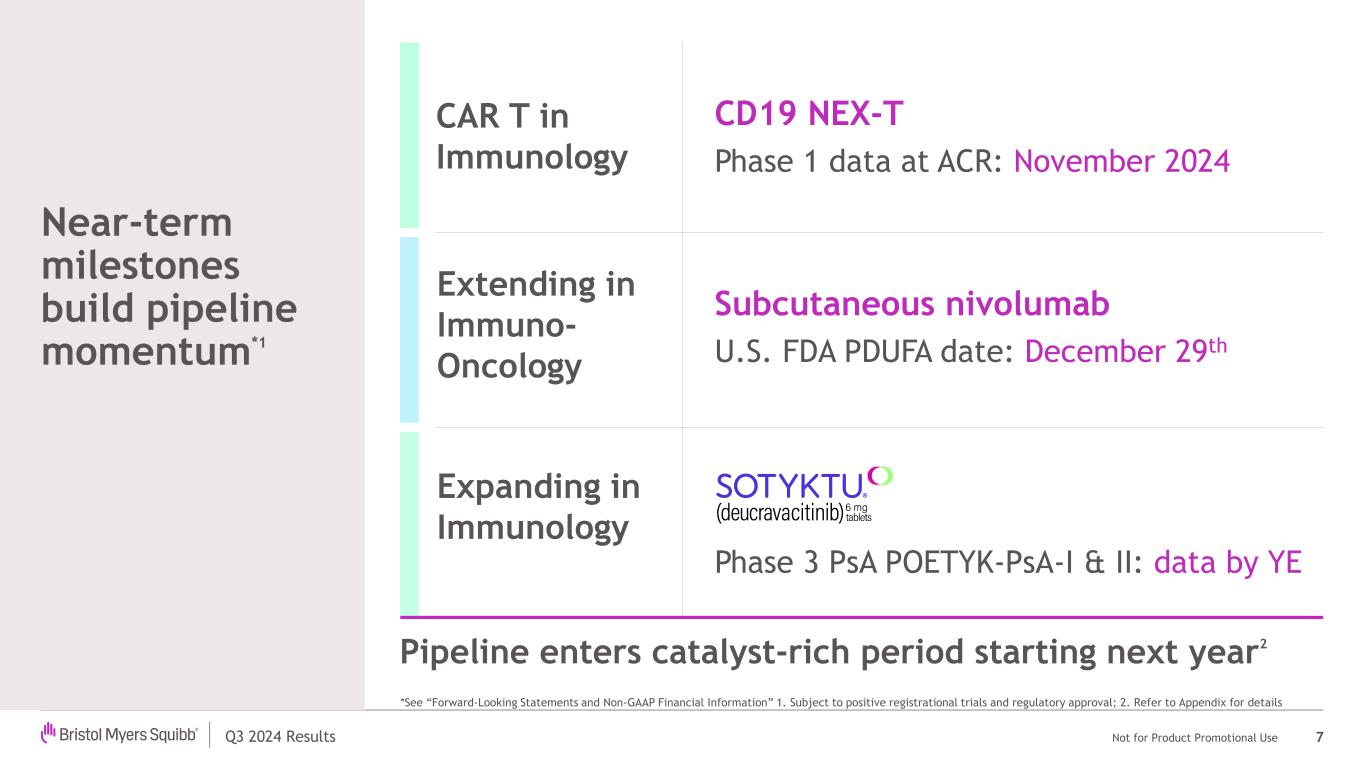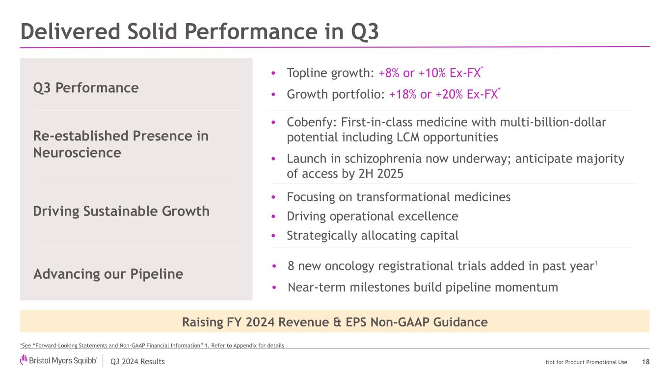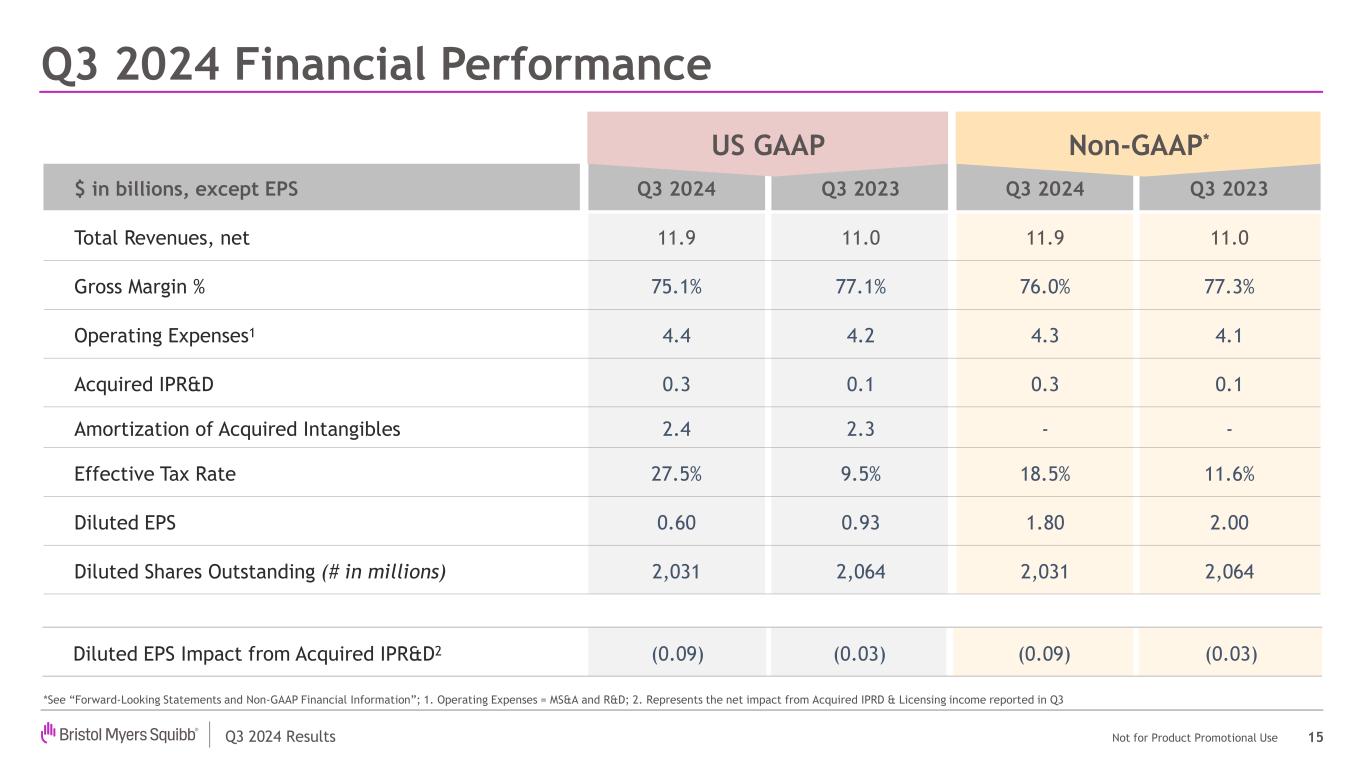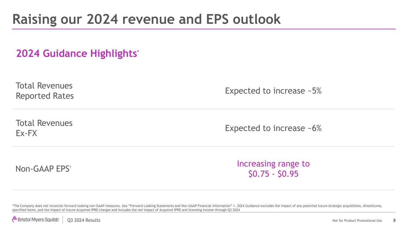 Not for Product Promotional UseQ3 2024 Results Forward Looking Statements and Non-GAAP Financial Information 2 This presentation contains statements about Bristol-Myers Squibb Company’s (the “Company”) future financial results, plans, business development strategy, anticipated clinical trials, results and regulatory approvals that constitute forward-looking statements for purposes of the safe harbor provisions under the Private Securities Litigation Reform Act of 1995. All statements that are not statements of historical facts are, or may be deemed to be, forward-looking statements. Actual results may differ materially from those expressed in, or implied by, these statements as a result of various factors, including, but not limited to: (i) new laws and regulations, (ii) our ability to obtain, protect and maintain market exclusivity rights and enforce patents and other intellectual property rights, (iii) our ability to achieve expected clinical, regulatory and contractual milestones on expected timelines or at all, (iv) difficulties or delays in the development and commercialization of new products, (v) difficulties or delays in our clinical trials and the manufacturing, distribution and sale of our products, (vi) adverse outcomes in legal or regulatory proceedings, (vii) risks relating to acquisitions, divestitures, alliances, joint ventures and other portfolio actions and (viii) political and financial instability, including changes in general economic conditions. These and other important factors are discussed in the Company’s most recent annual report on Form 10-K and reports on Forms 10-Q and 8-K. These documents are available on the U.S. Securities and Exchange Commission’s website, on the Company’s website or from Bristol-Myers Squibb Investor Relations. No forward- looking statements can be guaranteed. In addition, any forward-looking statements and clinical data included herein are presented only as of the date hereof. Except as otherwise required by applicable law, the Company undertakes no obligation to publicly update any of the provided information, whether as a result of new information, future events, changed circumstances or otherwise. This presentation includes certain non-generally accepted accounting principles (“GAAP”) financial measures that we use to describe the Company’s performance. The non-GAAP financial measures are provided as supplemental information and are presented because management has evaluated the Company’s financial results both including and excluding the adjusted items or the effects of foreign currency translation, as applicable, and believes that the non-GAAP financial measures presented portray the results of the Company’s baseline performance, supplement or enhance management’s, analysts’ and investors’ overall understanding of the Company’s underlying financial performance and trends and facilitate comparisons among current, past and future periods. This presentation also provides certain revenues and expenses excluding the impact of foreign exchange (“Ex- FX”). We calculate foreign exchange impacts by converting our current-period local currency financial results using the prior period average currency rates and comparing these adjusted amounts to our current-period results. Ex-FX financial measures are not accounted for according to GAAP because they remove the effects of currency movements from GAAP results. The non-GAAP information presented herein provides investors with additional useful information but should not be considered in isolation or as substitutes for the related GAAP measures. Moreover, other companies may define non-GAAP measures differently, which limits the usefulness of these measures for comparisons with such other companies. We encourage investors to review our financial statements and publicly filed reports in their entirety and not to rely on any single financial measure. An explanation of these non-GAAP financial measures and a reconciliation to the most directly comparable financial measure are available on our website at www.bms.com/investors. Also note that a reconciliation of forward-looking non-GAAP measures, including non-GAAP earnings per share (EPS), to the most directly comparable GAAP measures is not provided because comparable GAAP measures for such measures are not reasonably accessible or reliable due to the inherent difficulty in forecasting and quantifying measures that would be necessary for such reconciliation. Namely, we are not, without unreasonable effort, able to reliably predict the impact of accelerated depreciation and impairment charges, legal and other settlements, gains and losses from equity investments and other adjustments. In addition, the Company believes such a reconciliation would imply a degree of precision and certainty that could be confusing to investors. These items are uncertain, depend on various factors and may have a material impact on our future GAAP results.