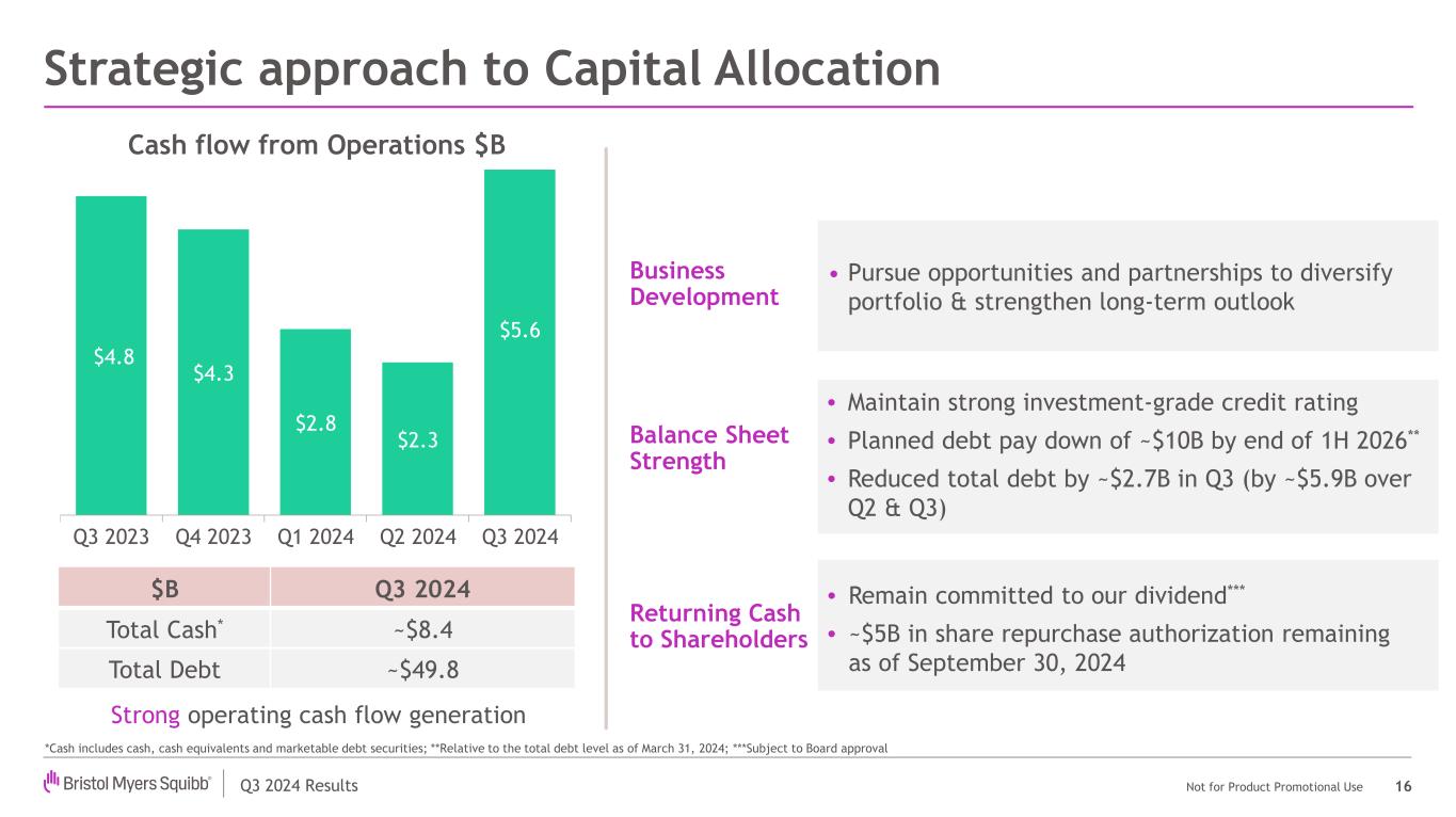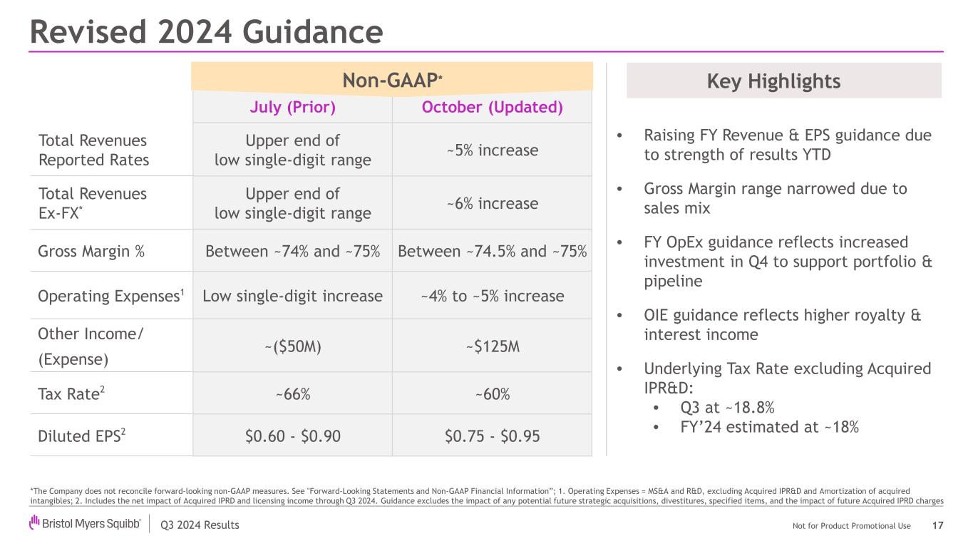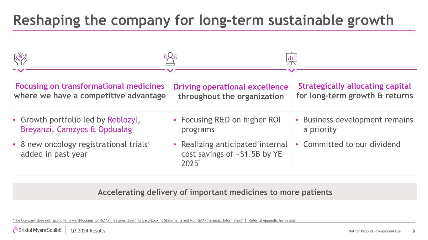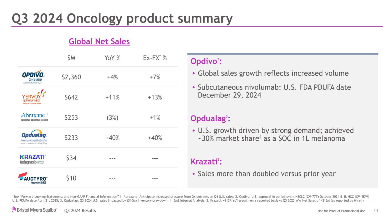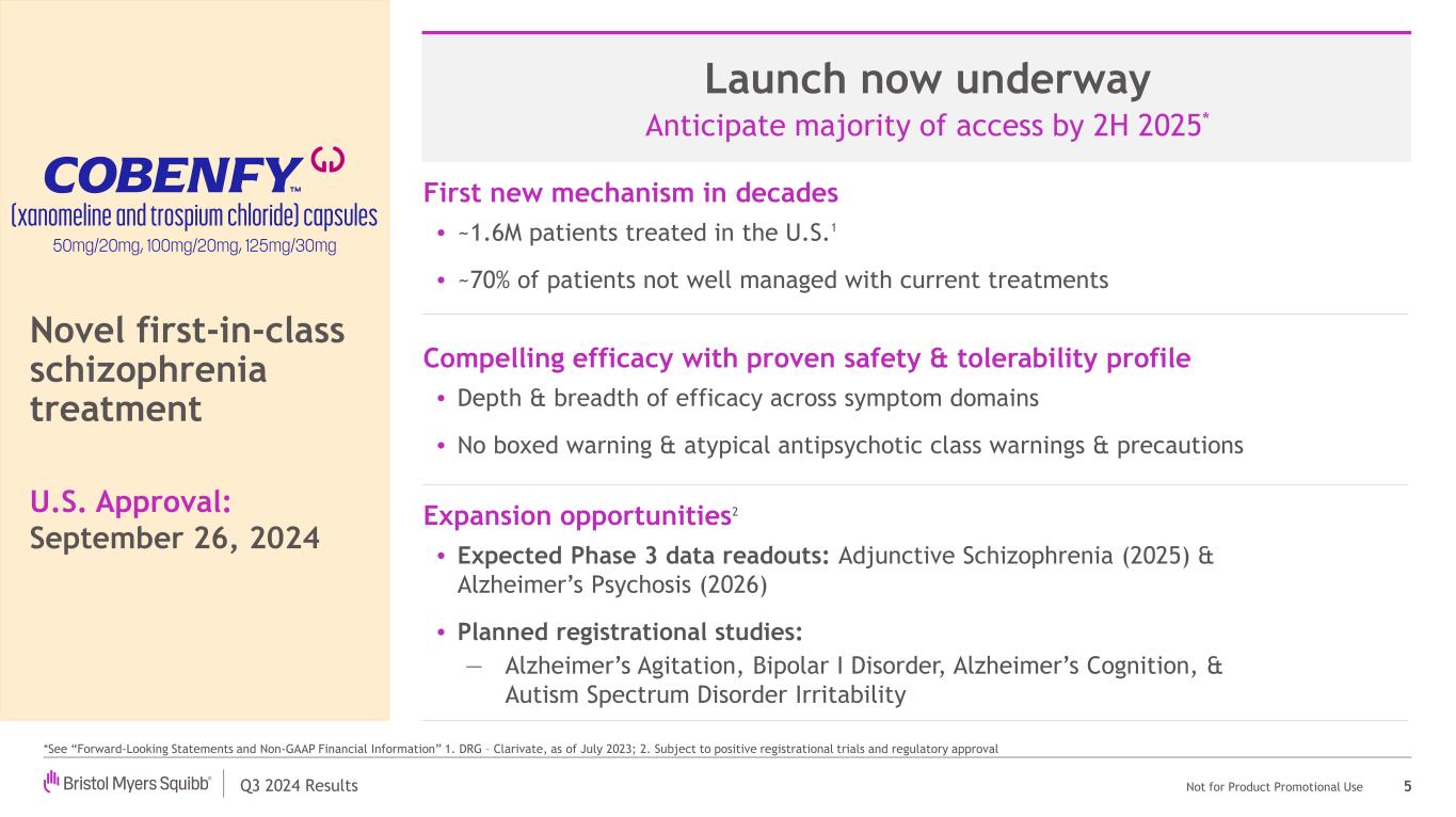 Not for Product Promotional UseQ3 2024 Results Forward Looking Statements and Non-GAAP Financial Information 2 This presentation contains statements about Bristol-Myers Squibb Company’s (the “Company”) future financial results, plans, business development strategy, anticipated clinical trials, results and regulatory approvals that constitute forward-looking statements for purposes of the safe harbor provisions under the Private Securities Litigation Reform Act of 1995. All statements that are not statements of historical facts are, or may be deemed to be, forward-looking statements. Actual results may differ materially from those expressed in, or implied by, these statements as a result of various factors, including, but not limited to: (i) new laws and regulations, (ii) our ability to obtain, protect and maintain market exclusivity rights and enforce patents and other intellectual property rights, (iii) our ability to achieve expected clinical, regulatory and contractual milestones on expected timelines or at all, (iv) difficulties or delays in the development and commercialization of new products, (v) difficulties or delays in our clinical trials and the manufacturing, distribution and sale of our products, (vi) adverse outcomes in legal or regulatory proceedings, (vii) risks relating to acquisitions, divestitures, alliances, joint ventures and other portfolio actions and (viii) political and financial instability, including changes in general economic conditions. These and other important factors are discussed in the Company’s most recent annual report on Form 10-K and reports on Forms 10-Q and 8-K. These documents are available on the U.S. Securities and Exchange Commission’s website, on the Company’s website or from Bristol-Myers Squibb Investor Relations. No forward- looking statements can be guaranteed. In addition, any forward-looking statements and clinical data included herein are presented only as of the date hereof. Except as otherwise required by applicable law, the Company undertakes no obligation to publicly update any of the provided information, whether as a result of new information, future events, changed circumstances or otherwise. This presentation includes certain non-generally accepted accounting principles (“GAAP”) financial measures that we use to describe the Company’s performance. The non-GAAP financial measures are provided as supplemental information and are presented because management has evaluated the Company’s financial results both including and excluding the adjusted items or the effects of foreign currency translation, as applicable, and believes that the non-GAAP financial measures presented portray the results of the Company’s baseline performance, supplement or enhance management’s, analysts’ and investors’ overall understanding of the Company’s underlying financial performance and trends and facilitate comparisons among current, past and future periods. This presentation also provides certain revenues and expenses excluding the impact of foreign exchange (“Ex- FX”). We calculate foreign exchange impacts by converting our current-period local currency financial results using the prior period average currency rates and comparing these adjusted amounts to our current-period results. Ex-FX financial measures are not accounted for according to GAAP because they remove the effects of currency movements from GAAP results. The non-GAAP information presented herein provides investors with additional useful information but should not be considered in isolation or as substitutes for the related GAAP measures. Moreover, other companies may define non-GAAP measures differently, which limits the usefulness of these measures for comparisons with such other companies. We encourage investors to review our financial statements and publicly filed reports in their entirety and not to rely on any single financial measure. An explanation of these non-GAAP financial measures and a reconciliation to the most directly comparable financial measure are available on our website at www.bms.com/investors. Also note that a reconciliation of forward-looking non-GAAP measures, including non-GAAP earnings per share (EPS), to the most directly comparable GAAP measures is not provided because comparable GAAP measures for such measures are not reasonably accessible or reliable due to the inherent difficulty in forecasting and quantifying measures that would be necessary for such reconciliation. Namely, we are not, without unreasonable effort, able to reliably predict the impact of accelerated depreciation and impairment charges, legal and other settlements, gains and losses from equity investments and other adjustments. In addition, the Company believes such a reconciliation would imply a degree of precision and certainty that could be confusing to investors. These items are uncertain, depend on various factors and may have a material impact on our future GAAP results.