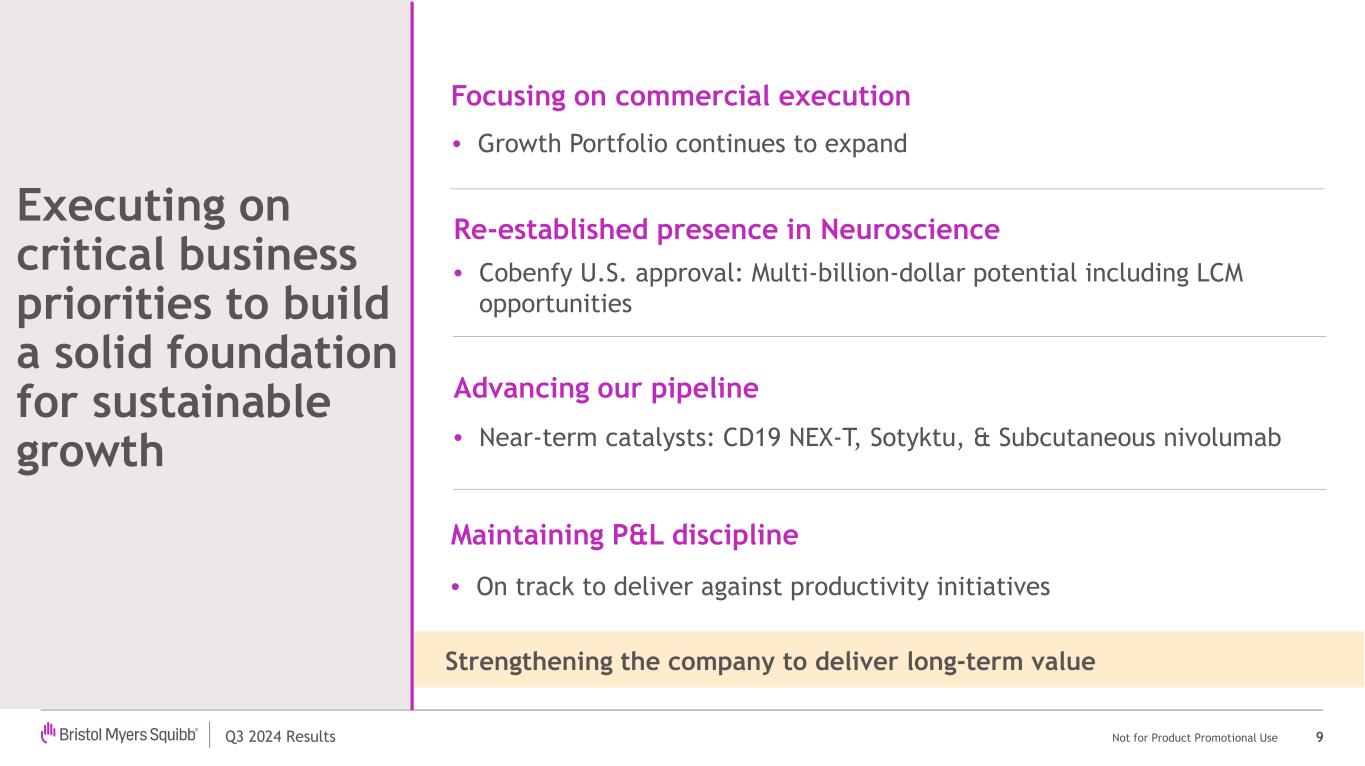 Q3 2024 Results Not for Product Promotional Use Executing on critical business priorities to build a solid foundation for sustainable growth 9 • Growth Portfolio continues to expand Focusing on commercial execution • Cobenfy U.S. approval: Multi-billion-dollar potential including LCM opportunities Re-established presence in Neuroscience • On track to deliver against productivity initiatives Maintaining P&L discipline • Near-term catalysts: CD19 NEX-T, Sotyktu, & Subcutaneous nivolumab Advancing our pipeline Strengthening the company to deliver long-term value