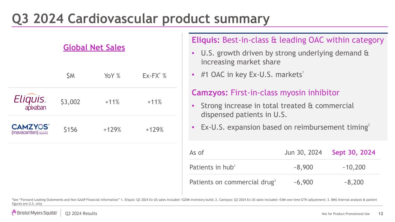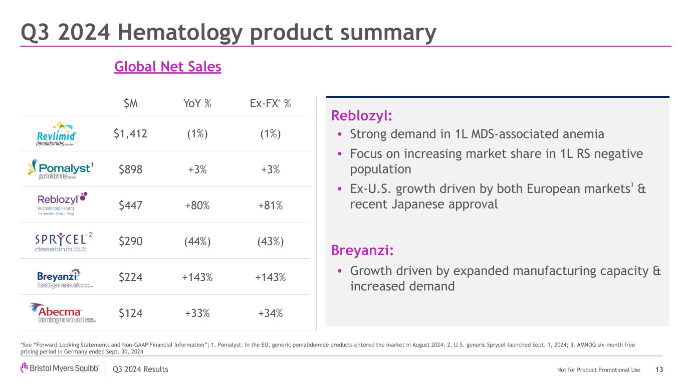 Q3 2024 Results Not for Product Promotional Use Q3 2024 Cardiovascular product summary 12 Eliquis: Best-in-class & leading OAC within category • U.S. growth driven by strong underlying demand & increasing market share • #1 OAC in key Ex-U.S. markets1 Camzyos: First-in-class myosin inhibitor • Strong increase in total treated & commercial dispensed patients in U.S. • Ex-U.S. expansion based on reimbursement timing2 Global Net Sales % $M YoY % Ex-FX* % $3,002 +11% +11% $156 +129% +129% As of Jun 30, 2024 Sept 30, 2024 Patients in hub3 ~8,900 ~10,200 Patients on commercial drug3 ~6,900 ~8,200 *See “Forward-Looking Statements and Non-GAAP Financial Information” 1. Eliquis: Q3 2024 Ex-US sales included +$20M inventory build; 2. Camzyos: Q3 2024 Ex-US sales included +$4M one-time GTN adjustment; 3. BMS internal analysis & patient figures are U.S. only