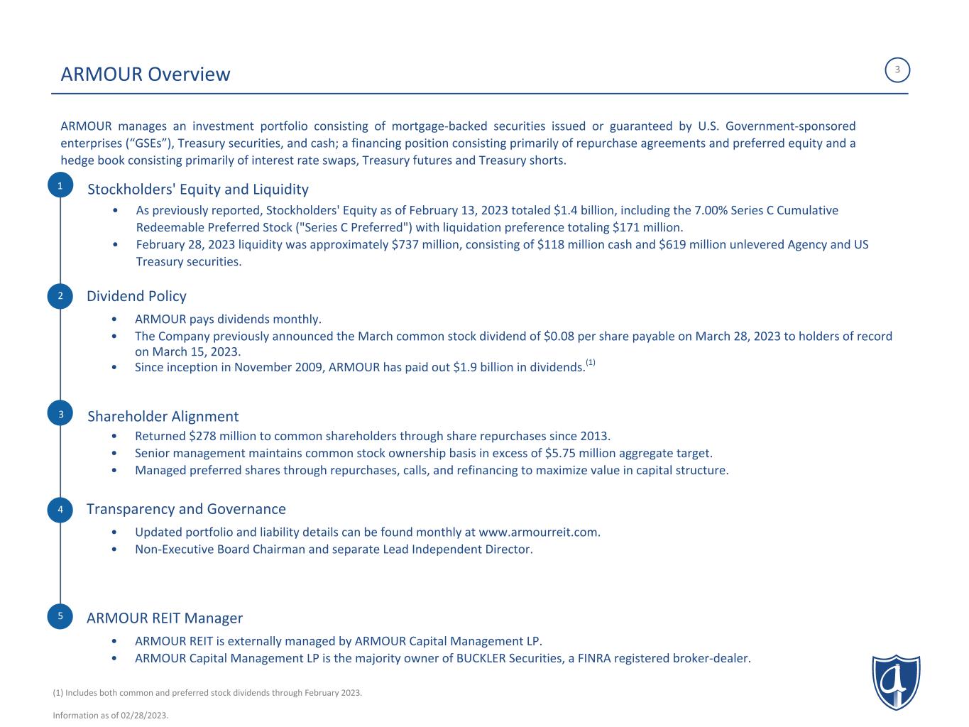 2 • Certain statements made in this presentation regarding ARMOUR Residential REIT, Inc. (“ARMOUR” or the “Company”), and any other statements regarding ARMOUR’s future expectations, beliefs, goals or prospects constitute “forward-looking statements” made within the meaning of the safe harbor provisions of the United States Private Securities Litigation Reform Act of 1995. Any statements that are not statements of historical fact (including statements containing the words “expect,” “estimate,” “project,” “budget,” “forecast,” “anticipate,” “intend,” “plan,” “may,” “will,” “could,” “should,” “believes,” “predicts,” “potential,” “continue,” and similar expressions) should also be considered forward-looking statements. Forward-looking statements include but are not limited to statements regarding the projections and future plans for ARMOUR’s business, growth and operational improvements. Because forward-looking statements relate to the future, they are subject to inherent uncertainties, risks and changes in circumstances that are difficult to predict and many of which are outside of ARMOUR’s control. A number of important factors could cause actual results or events to differ materially from those indicated by such forward-looking statements. Additional information concerning these factors and risks are contained in the Company’s most recent annual and quarterly reports and other reports filed with the Securities and Exchange Commission. ARMOUR assumes no obligation to update the information in this communication, except as otherwise required by law. Readers are cautioned not to place undue reliance on these forward-looking statements, which speak only as of the date hereof. • This material is for information purposes only and does not constitute an offer to sell, a solicitation of an offer to buy, or a recommendation for any securities or financial instruments. The statements, information and estimates contained herein are based on information that the Company believes to be reliable as of today's date unless otherwise indicated. ARMOUR cannot guarantee future results, levels of activity, performance or achievements. • Pricing and duration information are estimates provided by independent third-party providers based on models that require inputs and assumptions. Actual realized prices and durations will depend on a number of factors that cannot be predicted with certainty and may be materially different from estimates. • Estimates do not reflect any costs of operation of ARMOUR. • THE INFORMATION PRESENTED HEREIN IS UNAUDITED AND NOT REVIEWED BY OUR INDEPENDENT PUBLIC ACCOUNTANTS. PLEASE READ: Important Note Regarding Forward Looking Statements and Estimates