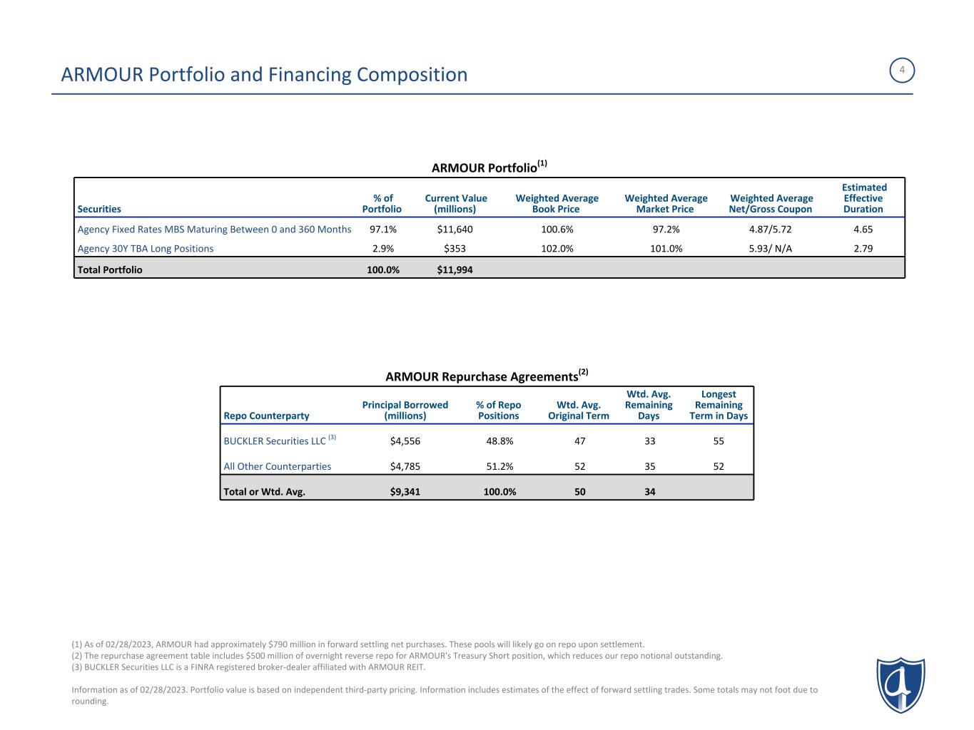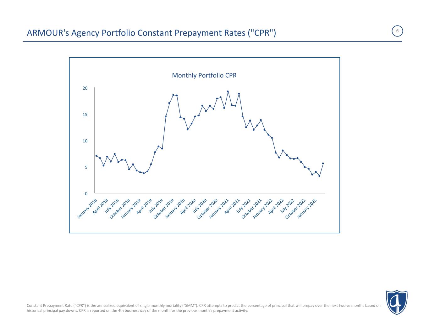 3 Stockholders' Equity and Liquidity Dividend Policy Shareholder Alignment Transparency and Governance ARMOUR REIT Manager • As previously reported, Stockholders' Equity as of February 13, 2023 totaled $1.4 billion, including the 7.00% Series C Cumulative Redeemable Preferred Stock ("Series C Preferred") with liquidation preference totaling $171 million. • February 28, 2023 liquidity was approximately $737 million, consisting of $118 million cash and $619 million unlevered Agency and US Treasury securities. • ARMOUR pays dividends monthly. • The Company previously announced the March common stock dividend of $0.08 per share payable on March 28, 2023 to holders of record on March 15, 2023. • Since inception in November 2009, ARMOUR has paid out $1.9 billion in dividends.(1) • Returned $278 million to common shareholders through share repurchases since 2013. • Senior management maintains common stock ownership basis in excess of $5.75 million aggregate target. • Managed preferred shares through repurchases, calls, and refinancing to maximize value in capital structure. • Updated portfolio and liability details can be found monthly at www.armourreit.com. • Non-Executive Board Chairman and separate Lead Independent Director. • ARMOUR REIT is externally managed by ARMOUR Capital Management LP. • ARMOUR Capital Management LP is the majority owner of BUCKLER Securities, a FINRA registered broker-dealer. ARMOUR Overview 1 (1) Includes both common and preferred stock dividends through February 2023. Information as of 02/28/2023. 2 3 4 5 ARMOUR manages an investment portfolio consisting of mortgage-backed securities issued or guaranteed by U.S. Government-sponsored enterprises (“GSEs”), Treasury securities, and cash; a financing position consisting primarily of repurchase agreements and preferred equity and a hedge book consisting primarily of interest rate swaps, Treasury futures and Treasury shorts.