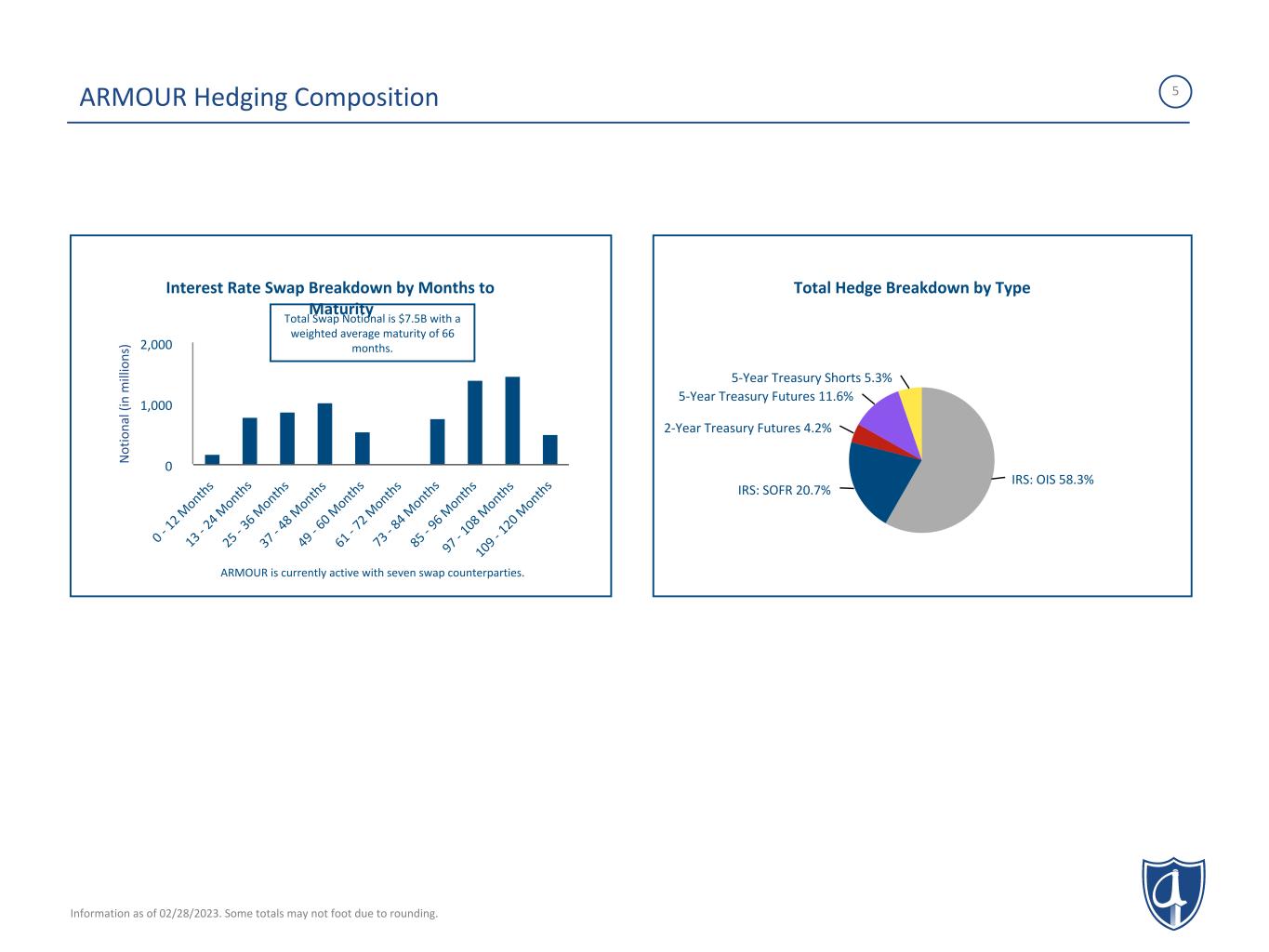 4 ARMOUR Portfolio(1) Securities % of Portfolio Current Value (millions) Weighted Average Book Price Weighted Average Market Price Weighted Average Net/Gross Coupon Estimated Effective Duration Agency Fixed Rates MBS Maturing Between 0 and 360 Months 97.1% $11,640 100.6% 97.2% 4.87/5.72 4.65 Agency 30Y TBA Long Positions 2.9% $353 102.0% 101.0% 5.93/ N/A 2.79 Total Portfolio 100.0% $11,994 ARMOUR Portfolio and Financing Composition (1) As of 02/28/2023, ARMOUR had approximately $790 million in forward settling net purchases. These pools will likely go on repo upon settlement. (2) The repurchase agreement table includes $500 million of overnight reverse repo for ARMOUR's Treasury Short position, which reduces our repo notional outstanding. (3) BUCKLER Securities LLC is a FINRA registered broker-dealer affiliated with ARMOUR REIT. Information as of 02/28/2023. Portfolio value is based on independent third-party pricing. Information includes estimates of the effect of forward settling trades. Some totals may not foot due to rounding. ARMOUR Repurchase Agreements(2) Repo Counterparty Principal Borrowed (millions) % of Repo Positions Wtd. Avg. Original Term Wtd. Avg. Remaining Days Longest Remaining Term in Days BUCKLER Securities LLC (3) $4,556 48.8% 47 33 55 All Other Counterparties $4,785 51.2% 52 35 52 Total or Wtd. Avg. $9,341 100.0% 50 34
