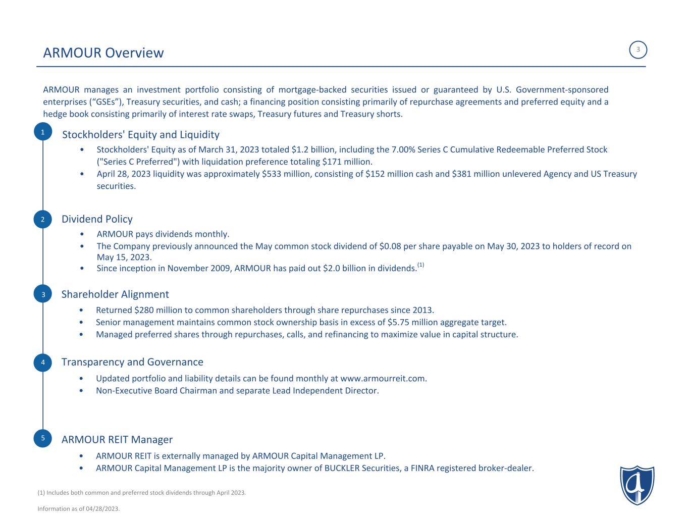 2 • Certain statements made in this presentation regarding ARMOUR Residential REIT, Inc. (“ARMOUR” or the “Company”), and any other statements regarding ARMOUR’s future expectations, beliefs, goals or prospects constitute “forward-looking statements” made within the meaning of the safe harbor provisions of the United States Private Securities Litigation Reform Act of 1995. Any statements that are not statements of historical fact (including statements containing the words “expect,” “estimate,” “project,” “budget,” “forecast,” “anticipate,” “intend,” “plan,” “may,” “will,” “could,” “should,” “believes,” “predicts,” “potential,” “continue,” and similar expressions) should also be considered forward-looking statements. Forward-looking statements include but are not limited to statements regarding the projections and future plans for ARMOUR’s business, growth and operational improvements. Because forward-looking statements relate to the future, they are subject to inherent uncertainties, risks and changes in circumstances that are difficult to predict and many of which are outside of ARMOUR’s control. A number of important factors could cause actual results or events to differ materially from those indicated by such forward-looking statements. Additional information concerning these factors and risks are contained in the Company’s most recent annual and quarterly reports and other reports filed with the Securities and Exchange Commission. ARMOUR assumes no obligation to update the information in this communication, except as otherwise required by law. Readers are cautioned not to place undue reliance on these forward-looking statements, which speak only as of the date hereof. • This material is for information purposes only and does not constitute an offer to sell, a solicitation of an offer to buy, or a recommendation for any securities or financial instruments. The statements, information and estimates contained herein are based on information that the Company believes to be reliable as of today's date unless otherwise indicated. ARMOUR cannot guarantee future results, levels of activity, performance or achievements. • Pricing and duration information are estimates provided by independent third-party providers based on models that require inputs and assumptions. Actual realized prices and durations will depend on a number of factors that cannot be predicted with certainty and may be materially different from estimates. • Estimates do not reflect any costs of operation of ARMOUR. • THE INFORMATION PRESENTED HEREIN IS UNAUDITED AND NOT REVIEWED BY OUR INDEPENDENT PUBLIC ACCOUNTANTS. PLEASE READ: Important Note Regarding Forward Looking Statements and Estimates