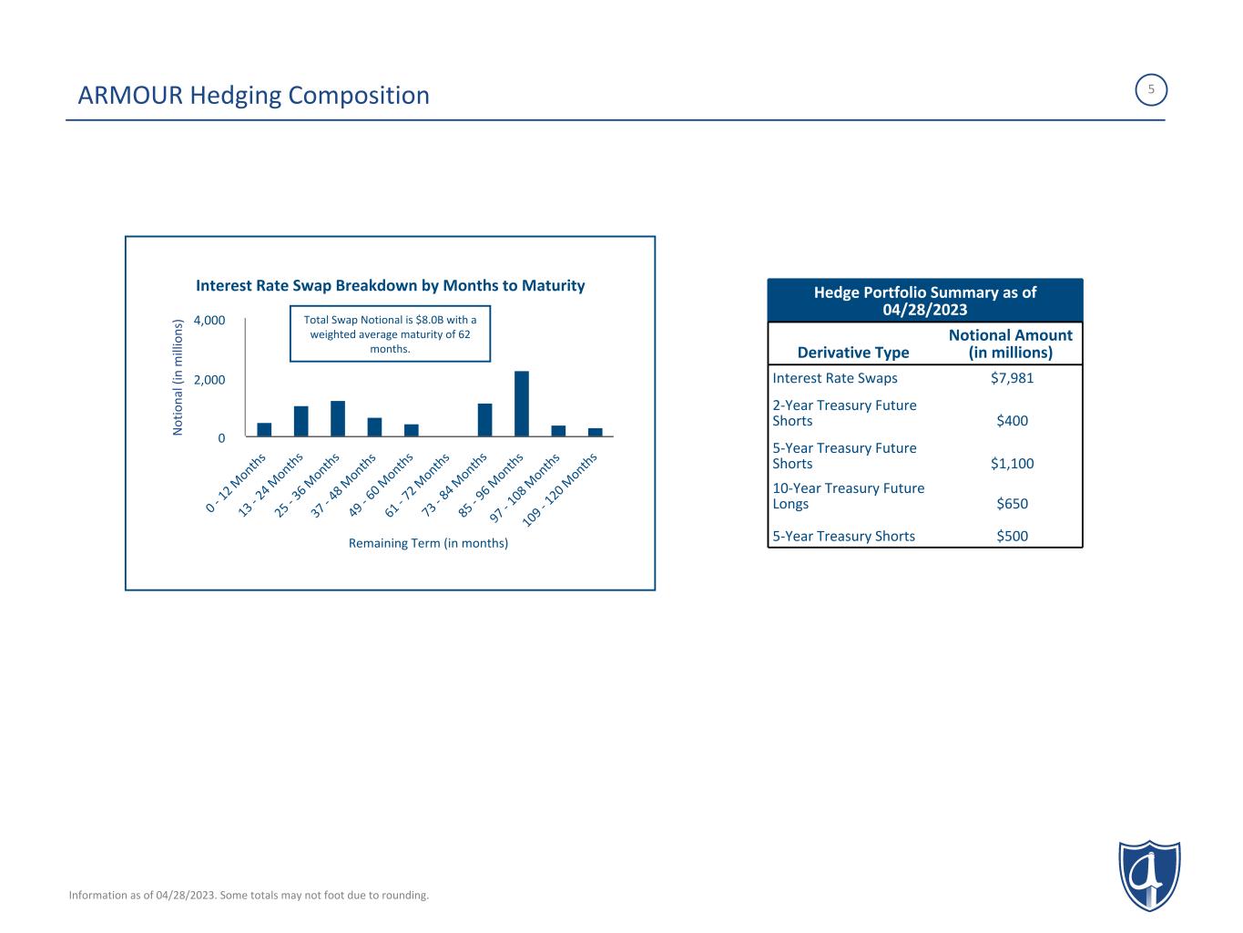 4 ARMOUR Portfolio Securities % of Portfolio Current Value (millions) Weighted Average Book Price Weighted Average Market Price Weighted Average Net/Gross Coupon Estimated Effective Duration Agency Fixed Rates MBS Maturing Between 0 and 360 Months 99.3% $11,979 100.6% 98.4% 4.90/5.75 4.34 Agency 30Y TBA Long Positions 6.6% $801 100.0% 100.1% 5.32/ N/A 3.14 Agency 30Y TBA Short Positions (6.0)% -$718 89.3% 89.7% 3.00/ N/A -6.89 Total Portfolio 100.0% $12,061 ARMOUR Portfolio and Financing Composition (1) The repurchase agreement table includes $500 million of overnight reverse repo for ARMOUR's Treasury Short position, which reduces our repo notional outstanding. (2) BUCKLER Securities LLC is a FINRA registered broker-dealer affiliated with ARMOUR REIT. Information as of 04/28/2023. Portfolio value is based on independent third-party pricing. Information includes estimates of the effect of forward settling trades. Some totals may not foot due to rounding. ARMOUR Repurchase Agreements(1) Repo Counterparty Principal Borrowed (millions) % of Repo Positions Wtd. Avg. Original Term Wtd. Avg. Remaining Days Longest Remaining Term in Days BUCKLER Securities LLC (2) $5,211 49.7% 35 16 48 All Other Counterparties $5,273 50.3% 53 31 77 Total or Wtd. Avg. $10,484 100.0% 44 24