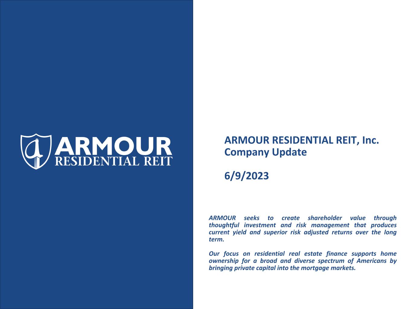 ARMOUR RESIDENTIAL REIT, Inc. Company Update 6/9/2023 ARMOUR seeks to create shareholder value through thoughtful investment and risk management that produces current yield and superior risk adjusted returns over the long term. Our focus on residential real estate finance supports home ownership for a broad and diverse spectrum of Americans by bringing private capital into the mortgage markets.