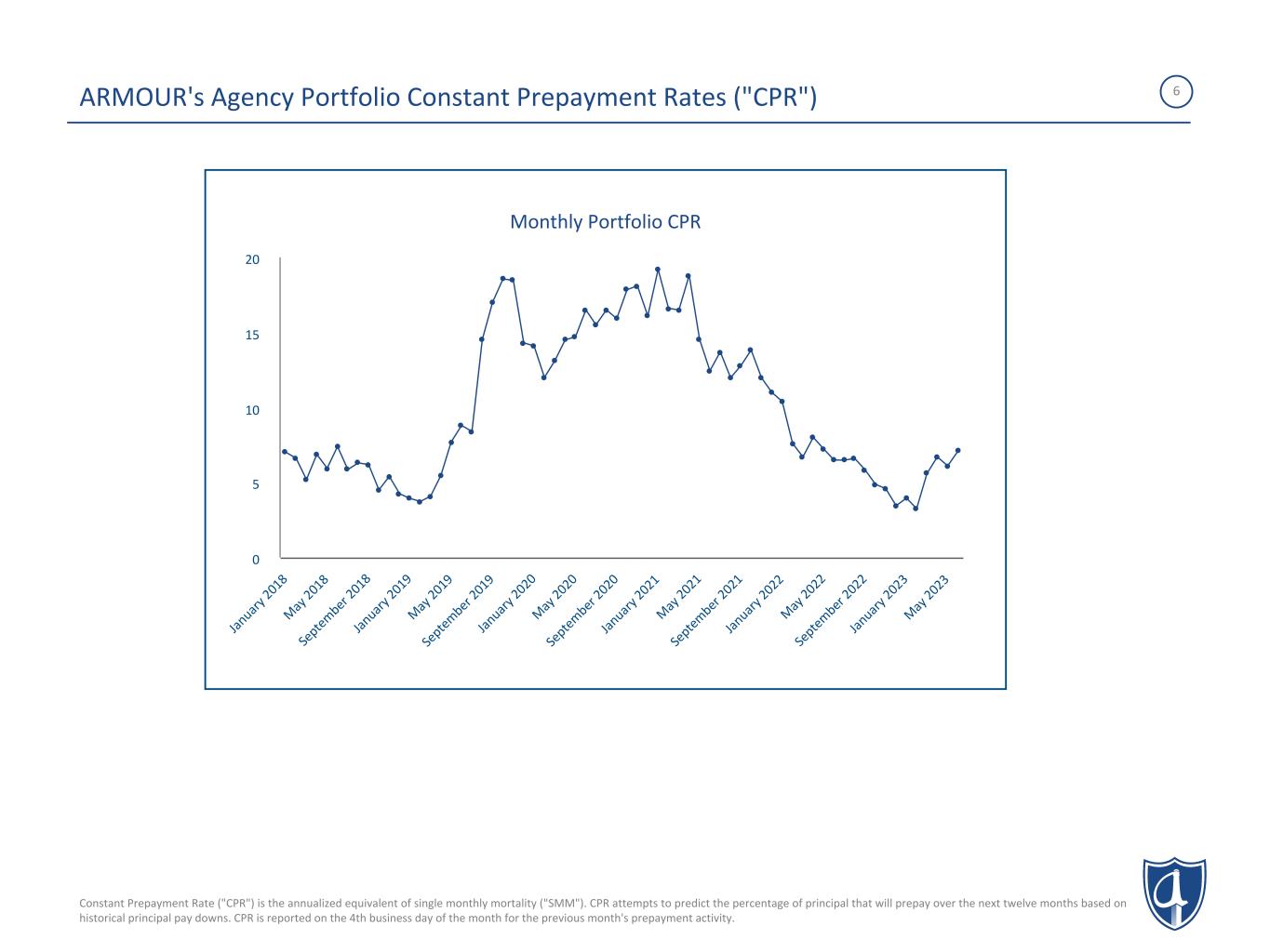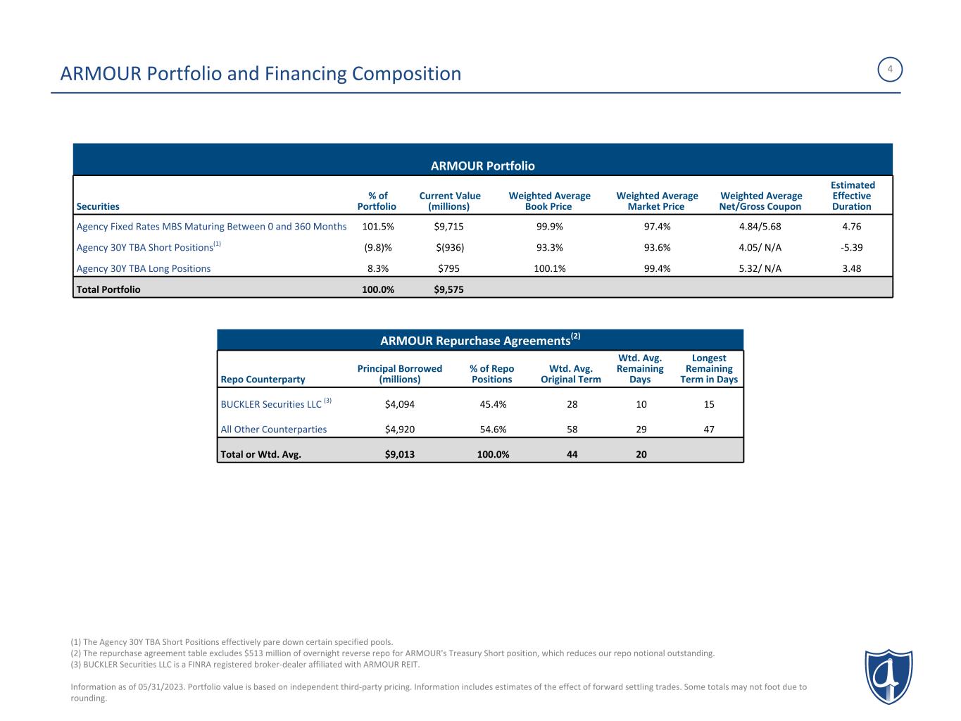 3 Stockholders' Equity and Liquidity Dividend Policy Shareholder Alignment Transparency and Governance ARMOUR REIT Manager • Stockholders' Equity as of March 31, 2023 totaled $1.2 billion, including the 7.00% Series C Cumulative Redeemable Preferred Stock ("Series C Preferred") with liquidation preference totaling $171 million. • May 31, 2023 liquidity was approximately $550 million, consisting of $96 million cash and $453 million unlevered Agency and US Treasury securities. • ARMOUR pays dividends monthly. • The Company previously announced the June common stock dividend of $0.08 per share payable on June 29, 2023 to holders of record on June 15, 2023. • Since inception in November 2009, ARMOUR has paid out $2.0 billion in dividends.(1) • Returned $282 million to common shareholders through share repurchases since 2013. • Senior management maintains common stock ownership basis in excess of $5.75 million aggregate target. • Managed preferred shares through repurchases, calls, and refinancing to maximize value in capital structure. • Updated portfolio and liability details can be found monthly at www.armourreit.com. • Non-Executive Board Chairman and separate Lead Independent Director. • ARMOUR REIT is externally managed by ARMOUR Capital Management LP. • ARMOUR Capital Management LP is the majority owner of BUCKLER Securities, a FINRA registered broker-dealer. ARMOUR Overview 1 (1) Includes both common and preferred stock dividends through May 2023. Information as of 05/31/2023. 2 3 4 5 ARMOUR manages an investment portfolio consisting of mortgage-backed securities issued or guaranteed by U.S. Government-sponsored enterprises (“GSEs”), Treasury securities, and cash; a financing position consisting primarily of repurchase agreements and preferred equity and a hedge book consisting primarily of interest rate swaps, Treasury futures and Treasury shorts.