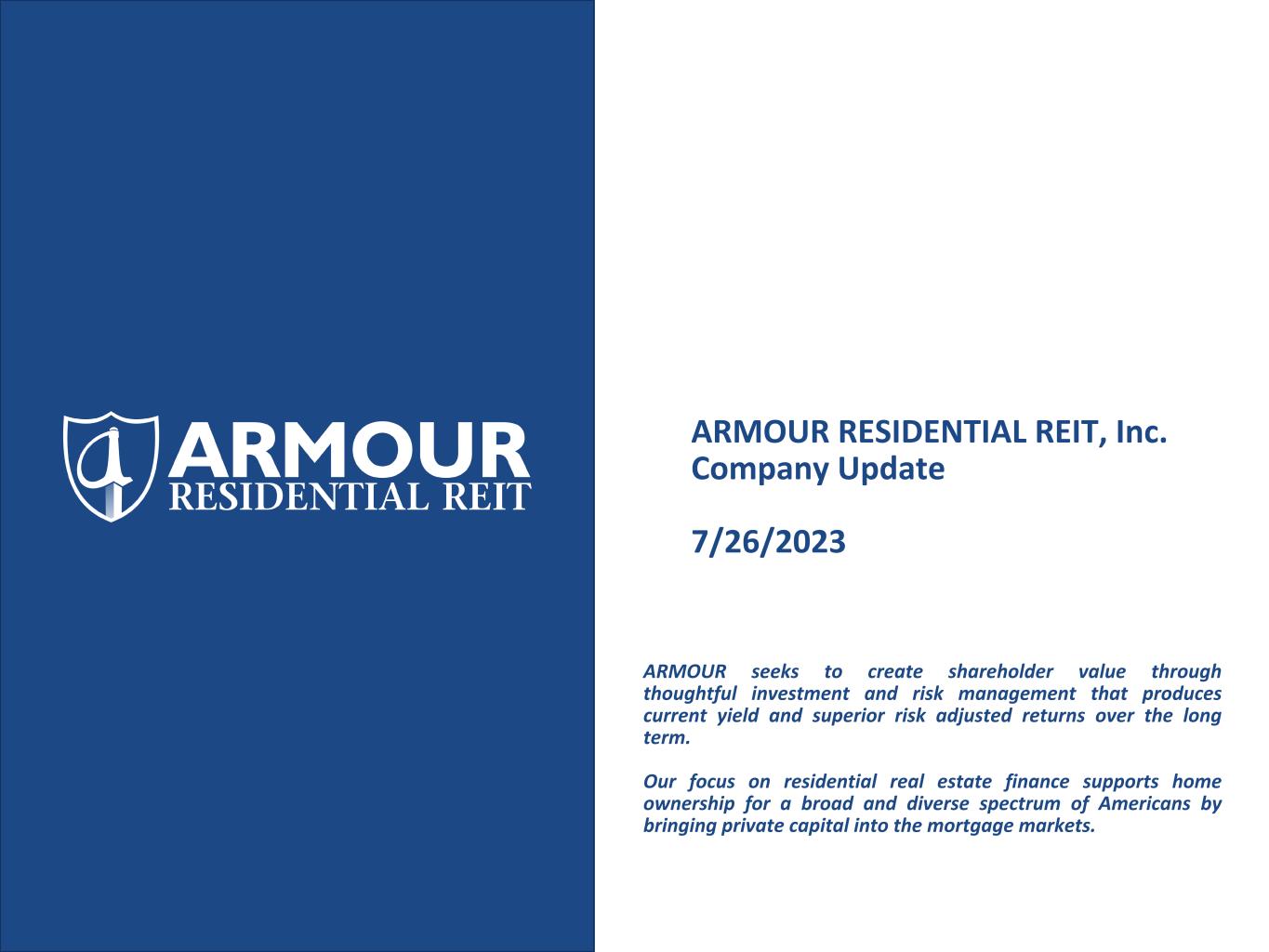 ARMOUR RESIDENTIAL REIT, Inc. Company Update 7/26/2023 ARMOUR seeks to create shareholder value through thoughtful investment and risk management that produces current yield and superior risk adjusted returns over the long term. Our focus on residential real estate finance supports home ownership for a broad and diverse spectrum of Americans by bringing private capital into the mortgage markets.
