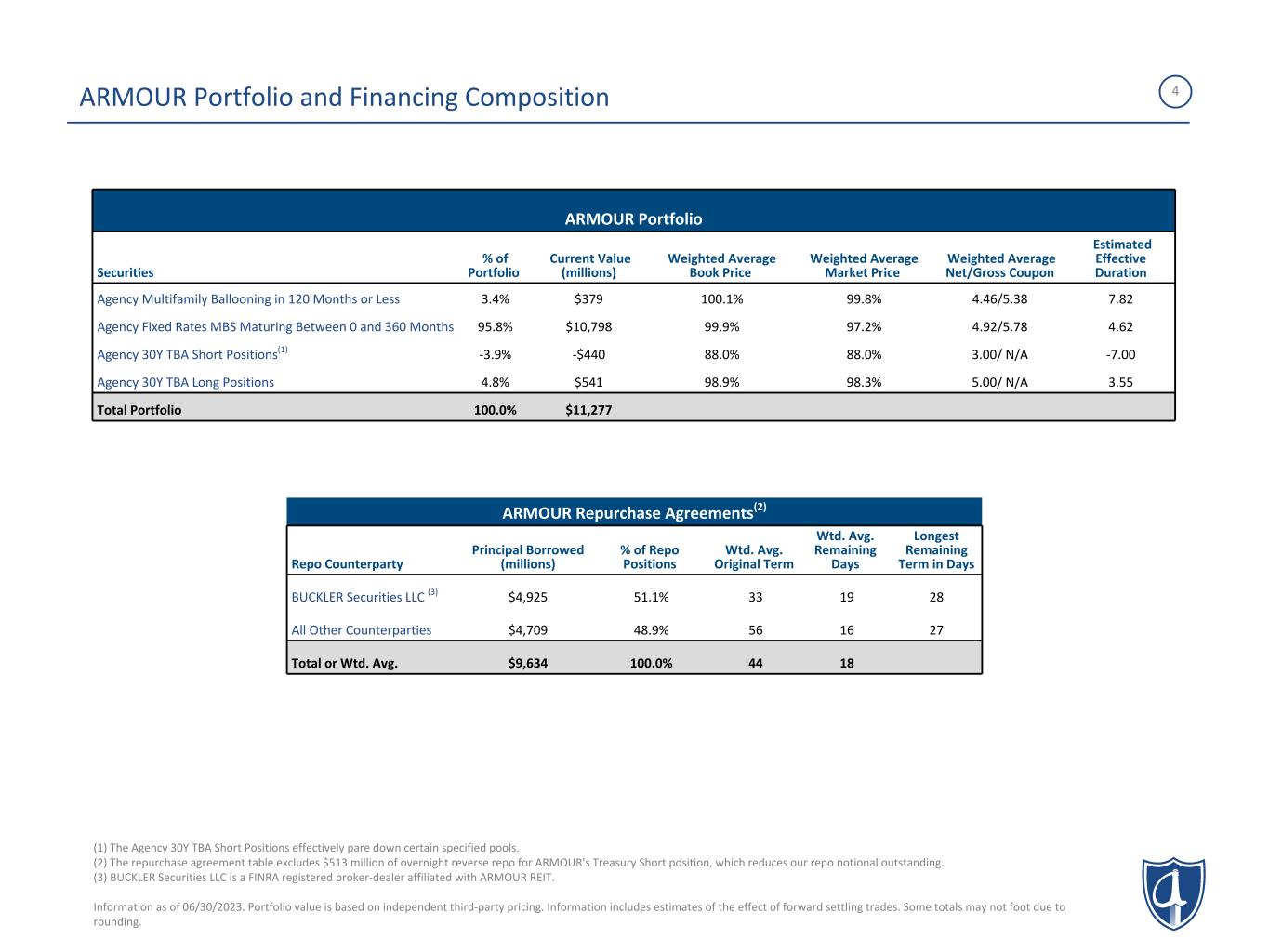 3 Stockholders' Equity and Liquidity Dividend Policy Shareholder Alignment Transparency and Governance ARMOUR REIT Manager • Stockholders' Equity as of June 30, 2023 totaled $1.3 billion, including the 7.00% Series C Cumulative Redeemable Preferred Stock ("Series C Preferred") with liquidation preference totaling $171 million. • Book Value per Common Share on June 30, 2023 was $5.38. At quarter-end, ARMOUR had 206,810,059 common shares outstanding. • June 30, 2023 liquidity was approximately $644 million, consisting of $164 million cash and $481 million unlevered Agency and US Treasury securities. • ARMOUR pays dividends monthly. • The Company previously announced the August common stock dividend of $0.08 per share payable on August 30, 2023 to holders of record on August 15, 2023. • Since inception in November 2009, ARMOUR has paid out $2.0 billion in dividends.(1) • Returned $282 million to common shareholders through share repurchases since 2013. • Senior management maintains common stock ownership basis in excess of $5.75 million aggregate target. • Managed preferred shares through repurchases, calls, and refinancing to maximize value in capital structure. • Updated portfolio and liability details can be found monthly at www.armourreit.com. • Non-Executive Board Chairman and separate Lead Independent Director. • ARMOUR REIT is externally managed by ARMOUR Capital Management LP. • ARMOUR Capital Management LP is the majority owner of BUCKLER Securities, a FINRA registered broker-dealer. ARMOUR Overview 1 (1) Includes both common and preferred stock dividends through June 2023. Information as of 06/30/2023. 2 3 4 5 ARMOUR manages an investment portfolio consisting of mortgage-backed securities issued or guaranteed by U.S. Government-sponsored enterprises (“GSEs”), Treasury securities, and cash; a financing position consisting primarily of repurchase agreements and preferred equity and a hedge book consisting primarily of interest rate swaps, Treasury futures and Treasury shorts.