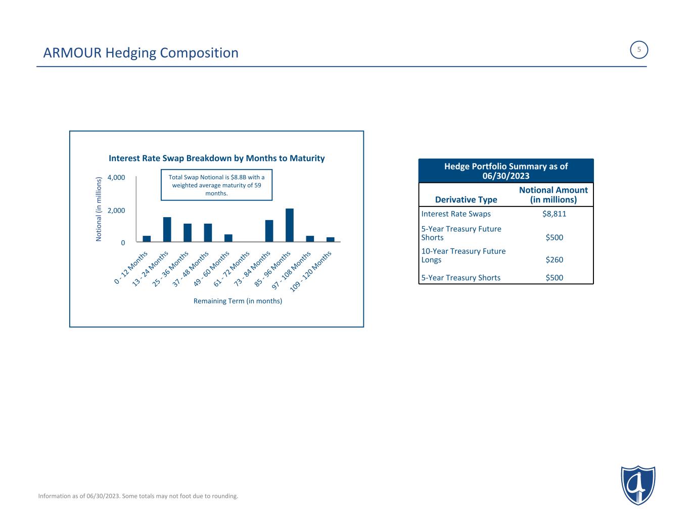 4 ARMOUR Portfolio Securities % of Portfolio Current Value (millions) Weighted Average Book Price Weighted Average Market Price Weighted Average Net/Gross Coupon Estimated Effective Duration Agency Multifamily Ballooning in 120 Months or Less 3.4% $379 100.1% 99.8% 4.46/5.38 7.82 Agency Fixed Rates MBS Maturing Between 0 and 360 Months 95.8% $10,798 99.9% 97.2% 4.92/5.78 4.62 Agency 30Y TBA Short Positions(1) -3.9% -$440 88.0% 88.0% 3.00/ N/A -7.00 Agency 30Y TBA Long Positions 4.8% $541 98.9% 98.3% 5.00/ N/A 3.55 Total Portfolio 100.0% $11,277 ARMOUR Portfolio and Financing Composition (1) The Agency 30Y TBA Short Positions effectively pare down certain specified pools. (2) The repurchase agreement table excludes $513 million of overnight reverse repo for ARMOUR's Treasury Short position, which reduces our repo notional outstanding. (3) BUCKLER Securities LLC is a FINRA registered broker-dealer affiliated with ARMOUR REIT. Information as of 06/30/2023. Portfolio value is based on independent third-party pricing. Information includes estimates of the effect of forward settling trades. Some totals may not foot due to rounding. ARMOUR Repurchase Agreements(2) Repo Counterparty Principal Borrowed (millions) % of Repo Positions Wtd. Avg. Original Term Wtd. Avg. Remaining Days Longest Remaining Term in Days BUCKLER Securities LLC (3) $4,925 51.1% 33 19 28 All Other Counterparties $4,709 48.9% 56 16 27 Total or Wtd. Avg. $9,634 100.0% 44 18