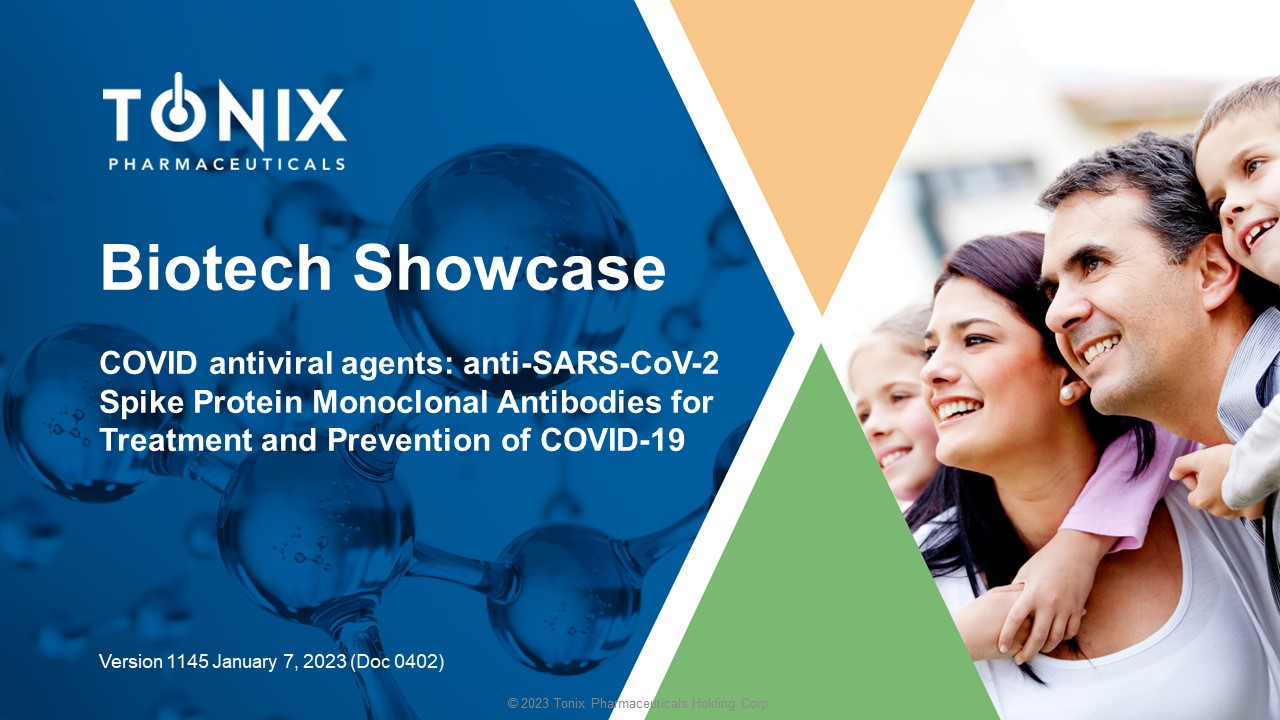 © 2023 Tonix Pharmaceuticals Holding Corp. Biotech Showcase COVID antiviral agents: anti - SARS - CoV - 2 Spike Protein Monoclonal Antibodies for Treatment and Prevention of COVID - 19 Version 1145 January 7, 2023 (Doc 0402)