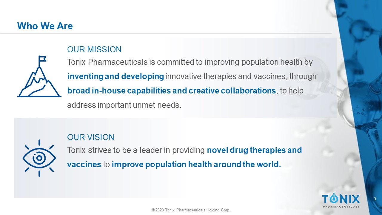 2 © 2023 Tonix Pharmaceuticals Holding Corp. Cautionary Note on Forward - Looking Statements Certain statements in this presentation regarding strategic plans, expectations and objectives for future operations or results are “forward - looking statements” as defined by the Private Securities Litigation Reform Act of 1995. These statements may be identified by the use of forward - looking words such as “anticipate,” “believe,” “forecast,” “estimate” and “intend,” among others. These forward - looking statements are based on Tonix’s current expectations and actual results could differ materially. There are a number of factors that could cause actual events to differ materially from those indicated by such forward - looking statements. These factors include, but are not limited to, the risks related to failure to obtain FDA clearances or approvals and noncompliance with FDA regulations; delays and uncertainties caused by the global COVID - 19 pandemic; risks related to the timing and progress of clinical development of our product candidates; our need for additional financing; uncertainties of patent protection and litigation; uncertainties of government or third party payor reimbursement; limited research and development efforts and dependence upon third parties; and substantial competition. As with any pharmaceutical under development, there are significant risks in the development, regulatory approval and commercialization of new products. The forward - looking statements in this presentation are made as of the date of this presentation, even if subsequently made available by Tonix on its website or otherwise. Tonix does not undertake an obligation to update or revise any forward - looking statement, except as required by law. Investors should read the risk factors set forth in the Annual Report on Form 10 - K for the year ended December 31, 2021, as filed with the Securities and Exchange Commission (the “SEC”) on March 14, 2022, and periodic reports and current reports filed with the SEC on or after the date thereof. All of Tonix's forward - looking statements are expressly qualified by all such risk factors and other cautionary statements.