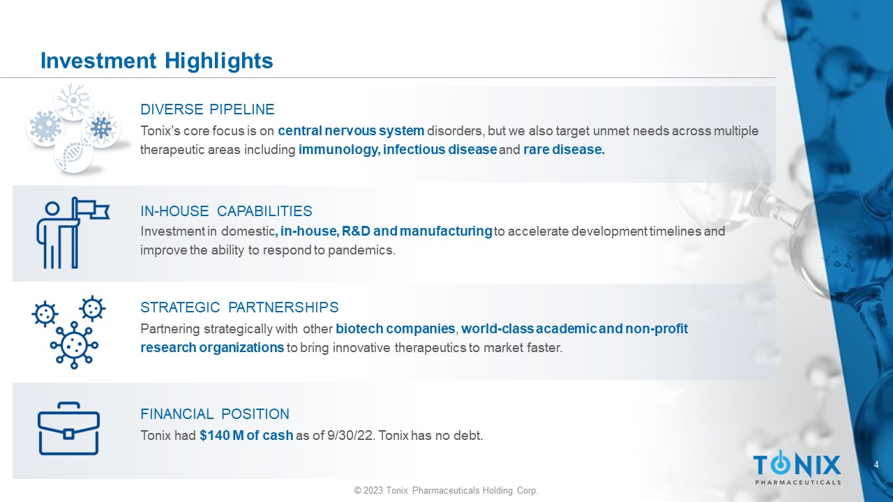 3 © 2023 Tonix Pharmaceuticals Holding Corp. Who We Are Tonix Pharmaceuticals is committed to improving population health by inventing and developing innovative therapies and vaccines, through broad in - house capabilities and creative collaborations , to help address important unmet needs. OUR MISSION Tonix strives to be a leader in providing novel drug therapies and vaccines to improve population health around the world. OUR VISION