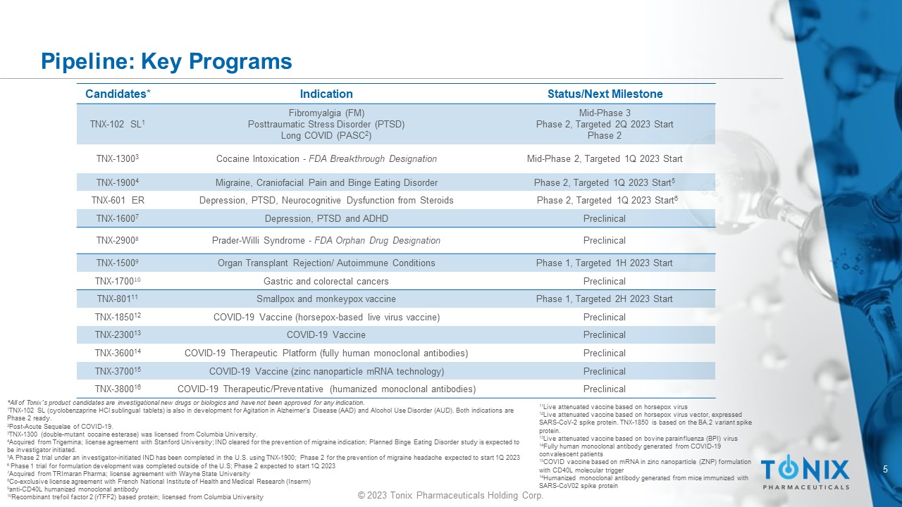 4 © 2023 Tonix Pharmaceuticals Holding Corp. Investment Highlights DIVERSE PIPELINE Tonix’s c ore focus is on central nervous system disorders , but we also target unmet needs across multiple therapeutic areas including immunology, infectious disease and rare disease. STRATEGIC PARTNERSHIPS Partnering strategically with other biotech companies , world - class academic and non - profit research organizations to bring innovative therapeutics to market faster. IN - HOUSE CAPABILITIES Investment in domestic , in - house, R&D and manufacturing to accelerate development timelines and improve the ability to respond to pandemics. FINANCIAL POSITION Tonix had $140 M of cash as of 9/30/22. Tonix has no debt .