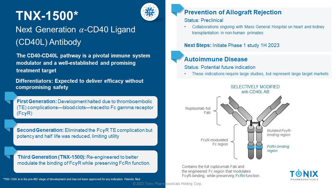 © 2023 Tonix Pharmaceuticals Holding Corp. TNX - 1500* Next Generation ߙ - CD40 Ligand (CD40L) Antibody The CD40 - CD40L pathway is a pivotal immune system modulator and a well - established and promising treatment target First Generation: Development halted due to thromboembolic (TE) complications — blood clots — traced to Fc gamma receptor (Fc ઻ R) Prevention of Allograft Rejection Status: Preclinical • Collaborations ongoing with Mass General Hospital on heart and kidney transplantation in non - human primates Next Steps: Initiate Phase 1 study 1H 2023 SELECTIVELY MODIFIED anti - CD40L AB Ruplizumab full Fab Contains the full ruplizumab Fab and the engineered Fc region that modulates Fc γ R - binding, while preserving FcRn function. Mutated Fc γ R - binding region FcRn - binding region Fc γ R - modulated Fc region Second Generation: Eliminated the Fc ઻ R TE complication but potency and half life was reduced, limiting utility Third Generation (TNX - 1500): Re - engineered to better modulate the binding of Fc ઻ R while preserving FcRn function. *TNX - 1500 is in the pre - IND stage of development and has not been approved for any indication. Patents filed. Differentiators: Expected to deliver efficacy without compromising safety Autoimmune Disease Status: Potential future indication • These indications require large studies, but represent large target markets