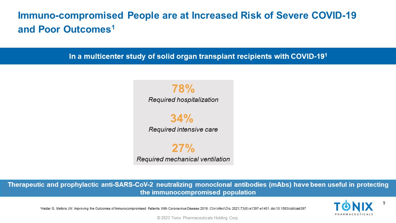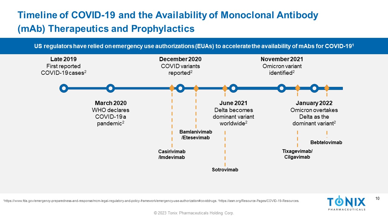 9 © 2023 Tonix Pharmaceuticals Holding Corp. 9 Immuno - compromised People are at Increased Risk of Severe COVID - 19 and Poor Outcomes 1 78% Required hospitalization 34% Required intensive care 27% Required mechanical ventilation In a multicenter study of solid organ transplant recipients with COVID - 19 1 1 Haidar G, Mellors JW. Improving the Outcomes of Immunocompromised Patients With Coronavirus Disease 2019. Clin Infect Dis . 2021;73(6):e1397 - e1401. doi:10.1093/ cid /ciab397 Therapeutic and prophylactic anti - SARS - CoV - 2 neutralizing monoclonal antibodies ( mAbs ) have been useful in protecting the immunocompromised population