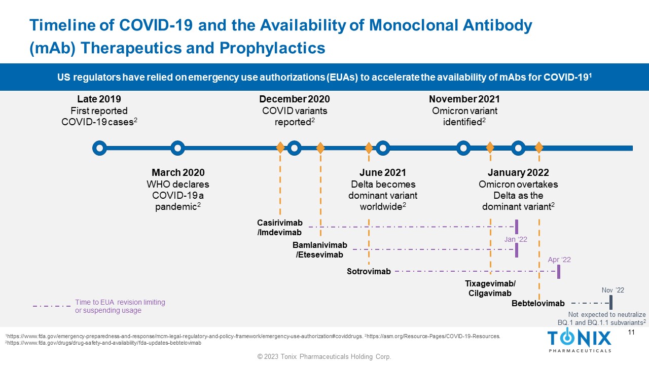 10 © 2023 Tonix Pharmaceuticals Holding Corp. 10 Timeline of COVID - 19 and the Availability of Monoclonal Antibody ( mAb ) Therapeutics and Prophylactics 1 https://www.fda.gov/emergency - preparedness - and - response/mcm - legal - regulatory - and - policy - framework/emergency - use - authorization#co viddrugs. 2 https://asm.org/Resource - Pages/COVID - 19 - Resources. Late 2019 First reported COVID - 19 cases 2 December 2020 COVID variants reported 2 June 2021 Delta becomes dominant variant worldwide 2 November 2021 Omicron variant identified 2 March 2020 WHO declares COVID - 19 a pandemic 2 Casirivimab /Imdevimab Bamlanivimab / Etesevimab Tixagevimab / Cilgavimab Bebtelovimab Sotrovimab January 2022 Omicron overtakes Delta as the dominant variant 2 US regulators have relied on emergency use authorizations (EUAs) to accelerate the availability of mAbs for COVID - 19 1