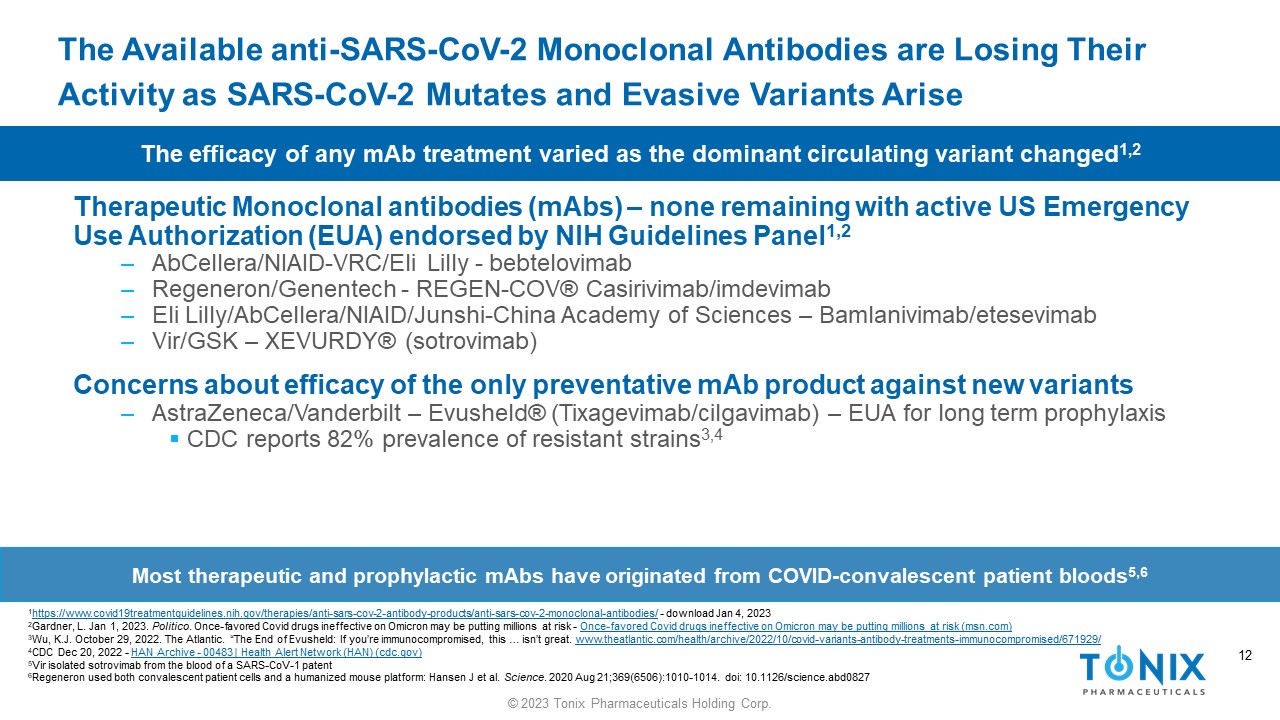 11 © 2023 Tonix Pharmaceuticals Holding Corp. 11 Timeline of COVID - 19 and the Availability of Monoclonal Antibody ( mAb ) Therapeutics and Prophylactics 1 https://www.fda.gov/emergency - preparedness - and - response/mcm - legal - regulatory - and - policy - framework/emergency - use - authorization#co viddrugs. 2 https://asm.org/Resource - Pages/COVID - 19 - Resources. 2 https://www.fda.gov/drugs/drug - safety - and - availability/fda - updates - bebtelovimab US regulators have relied on emergency use authorizations (EUAs) to accelerate the availability of mAbs for COVID - 19 1 Late 2019 First reported COVID - 19 cases 2 December 2020 COVID variants reported 2 June 2021 Delta becomes dominant variant worldwide 2 November 2021 Omicron variant identified 2 March 2020 WHO declares COVID - 19 a pandemic 2 Casirivimab /Imdevimab Bamlanivimab / Etesevimab Tixagevimab / Cilgavimab Bebtelovimab Sotrovimab January 2022 Omicron overtakes Delta as the dominant variant 2 Jan ‘22 Apr ‘22 Time to EUA revision limiting or suspending usage Nov ’22 Not expected to neutralize BQ.1 and BQ.1.1 subvariants 2