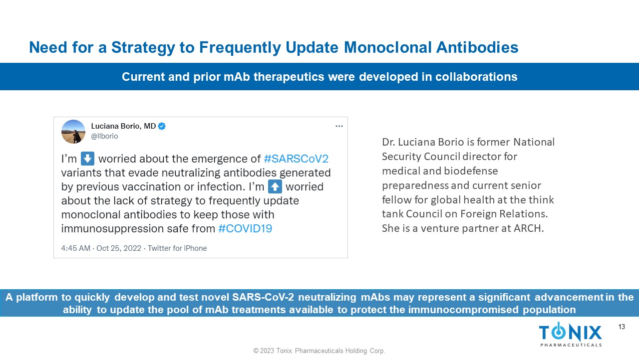 12 © 2023 Tonix Pharmaceuticals Holding Corp. 12 The Available anti - SARS - CoV - 2 Monoclonal Antibodies are Losing Their Activity as SARS - CoV - 2 Mutates and Evasive Variants Arise The efficacy of any mAb treatment varied as the dominant circulating variant changed 1,2 1 https://www.covid19treatmentguidelines.nih.gov/therapies/anti - sars - cov - 2 - antibody - products/anti - sars - cov - 2 - monoclonal - antibodies / - download Jan 4, 2023 2 Gardner, L. Jan 1, 2023. Politico . Once - favored Covid drugs ineffective on Omicron may be putting millions at risk - Once - favored Covid drugs ineffective on Omicron may be putting millions at risk (msn.com) 3 Wu, K.J. October 29, 2022. The Atlantic. “ The End of Evusheld : If you’re immunocompromised, this … isn’t great. www.theatlantic.com/health/archive/2022/10/covid - variants - antibody - treatments - immunocompromised/671929/ 4 CDC Dec 20, 2022 - HAN Archive - 00483 | Health Alert Network (HAN) (cdc.gov) 5 Vir isolated sotrovimab from the blood of a SARS - CoV - 1 patent 6 Regeneron used both convalescent patient cells and a humanized mouse platform: Hansen J et al. Science . 2020 Aug 21;369(6506):1010 - 1014. doi : 10.1126/science.abd0827 Most therapeutic and prophylactic mAbs have originated from COVID - convalescent patient bloods 5,6 Therapeutic Monoclonal antibodies ( mAbs ) – none remaining with active US Emergency Use Authorization (EUA) endorsed by NIH Guidelines Panel 1,2 ‒ AbCellera /NIAID - VRC/Eli Lilly - bebtelovimab ‒ Regeneron/Genentech - REGEN - COV® Casirivimab/imdevimab ‒ Eli Lilly/ AbCellera /NIAID/ Junshi - China Academy of Sciences – B amlanivimab / etesevimab ‒ Vir /GSK – XEVURDY® (sotrovimab) Concerns about efficacy of the only preventative mAb product against new variants ‒ AstraZeneca/Vanderbilt – Evusheld ® ( Tixagevimab / cilgavimab ) – EUA for long term prophylaxis ▪ CDC reports 82% prevalence of resistant strain s 3,4