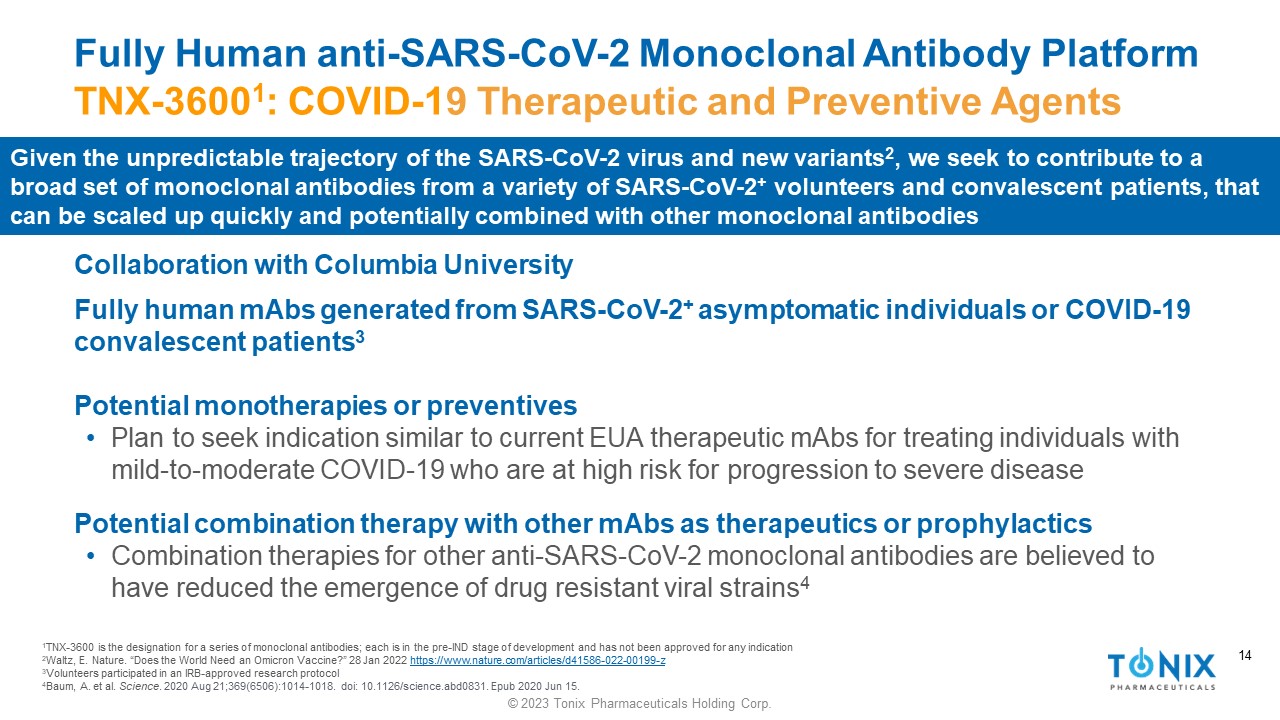 13 © 2023 Tonix Pharmaceuticals Holding Corp. 13 Need for a Strategy to Frequently Update Monoclonal Antibodies Current and prior mAb therapeutics were developed in collaborations A platform to quickly develop and test novel SARS - CoV - 2 neutralizing mAbs may represent a significant advancement in the ability to update the pool of mAb treatments available to protect the immunocompromised population Dr. Luciana Borio is former National Security Council director for medical and biodefense preparedness and current senior fellow for global health at the think tank Council on Foreign Relations. She is a venture partner at ARCH.
