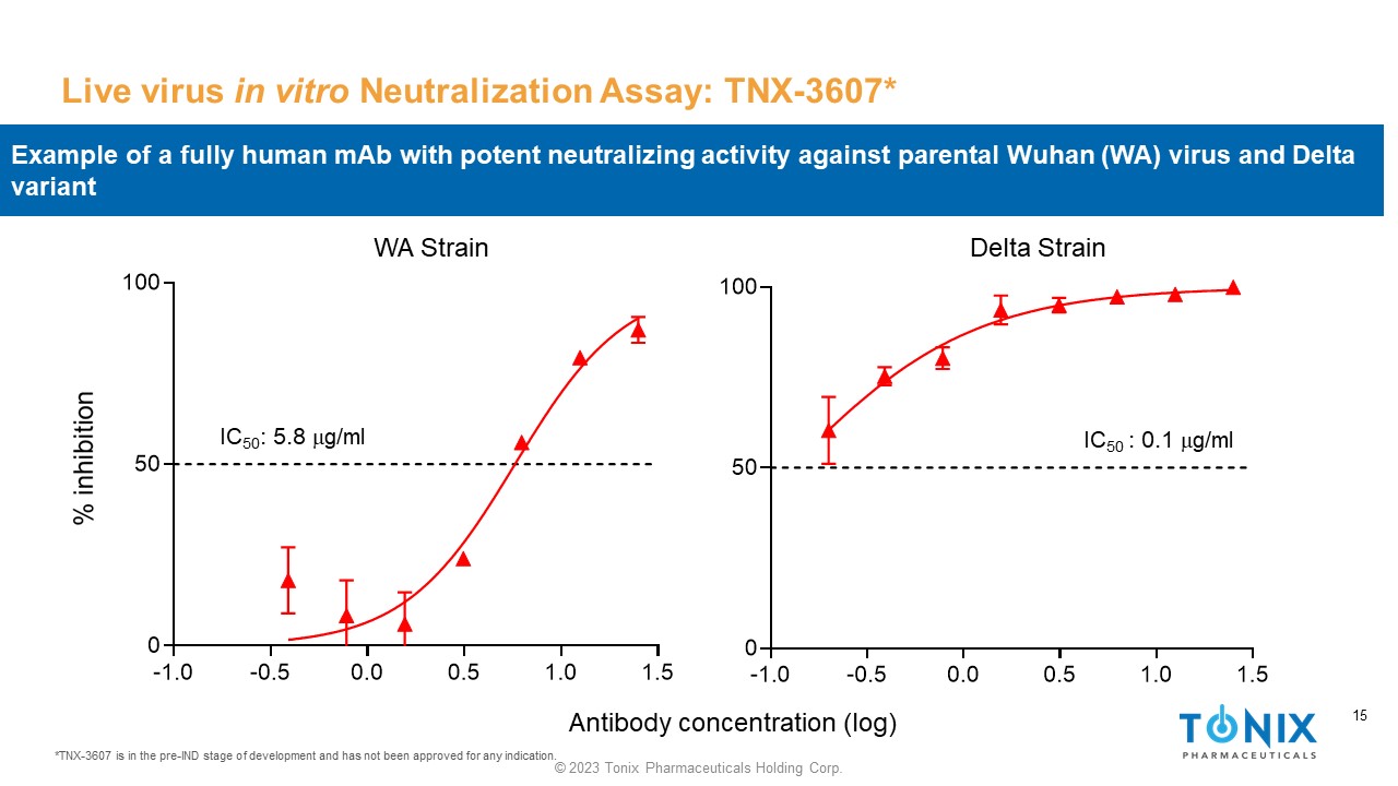 © 2023 Tonix Pharmaceuticals Holding Corp. 14 Fully Human anti - SARS - CoV - 2 Monoclonal Antibody Platform TNX - 3600 1 : COVID - 1 9 Therapeutic and Preventive Agents 14 Collaboration with Columbia University Fully human mAbs generated from SARS - CoV - 2 + asymptomatic individuals or COVID - 19 convalescent patients 3 Potential monotherapies or preventives • Plan to seek indication similar to current EUA therapeutic mAbs for treating individuals with mild - to - moderate COVID - 19 who are at high risk for progression to severe disease Potential combination therapy with other mAbs as therapeutics or prophylactics • Combination therapies for other anti - SARS - CoV - 2 monoclonal antibodies are believed to have reduced the emergence of drug resistant viral strains 4 1 TNX - 3600 is the designation for a series of monoclonal antibodies; each is in the pre - IND stage of development and has not been approved for any indication 2 Waltz, E. Nature. “Does the World Need an Omicron Vaccine?” 28 Jan 2022 https://www.nature.com/articles/d41586 - 022 - 00199 - z 3 Volunteers participated in an IRB - approved research protocol 4 Baum, A. et al. Science . 2020 Aug 21;369(6506):1014 - 1018. doi : 10.1126/science.abd0831. Epub 2020 Jun 15. Given the unpredictable trajectory of the SARS - CoV - 2 virus and new variants 2 , we seek to contribute to a broad set of monoclonal antibodies from a variety of SARS - CoV - 2 + volunteers and convalescent patients, that can be scaled up quickly and potentially combined with other monoclonal antibodies