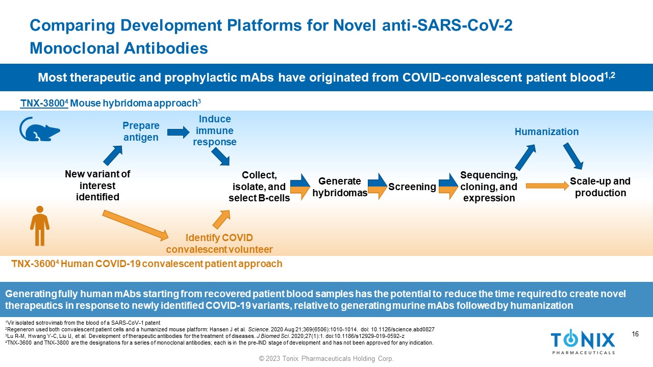15 © 2023 Tonix Pharmaceuticals Holding Corp. 15 Live virus in vitro Neutralization Assay: TNX - 3607* *TNX - 3607 is in the pre - IND stage of development and has not been approved for any indication. -1.0 -0.5 0.0 0.5 1.0 1.5 0 50 100 IC 50 : 5.8 m g/ml -1.0 -0.5 0.0 0.5 1.0 1.5 0 50 100 IC 50 : 0.1 m g/ml WA Strain Delta Strain Antibody concentration (log) Example of a fully human mAb with potent neutralizing activity against parental Wuhan (WA) virus and Delta variant