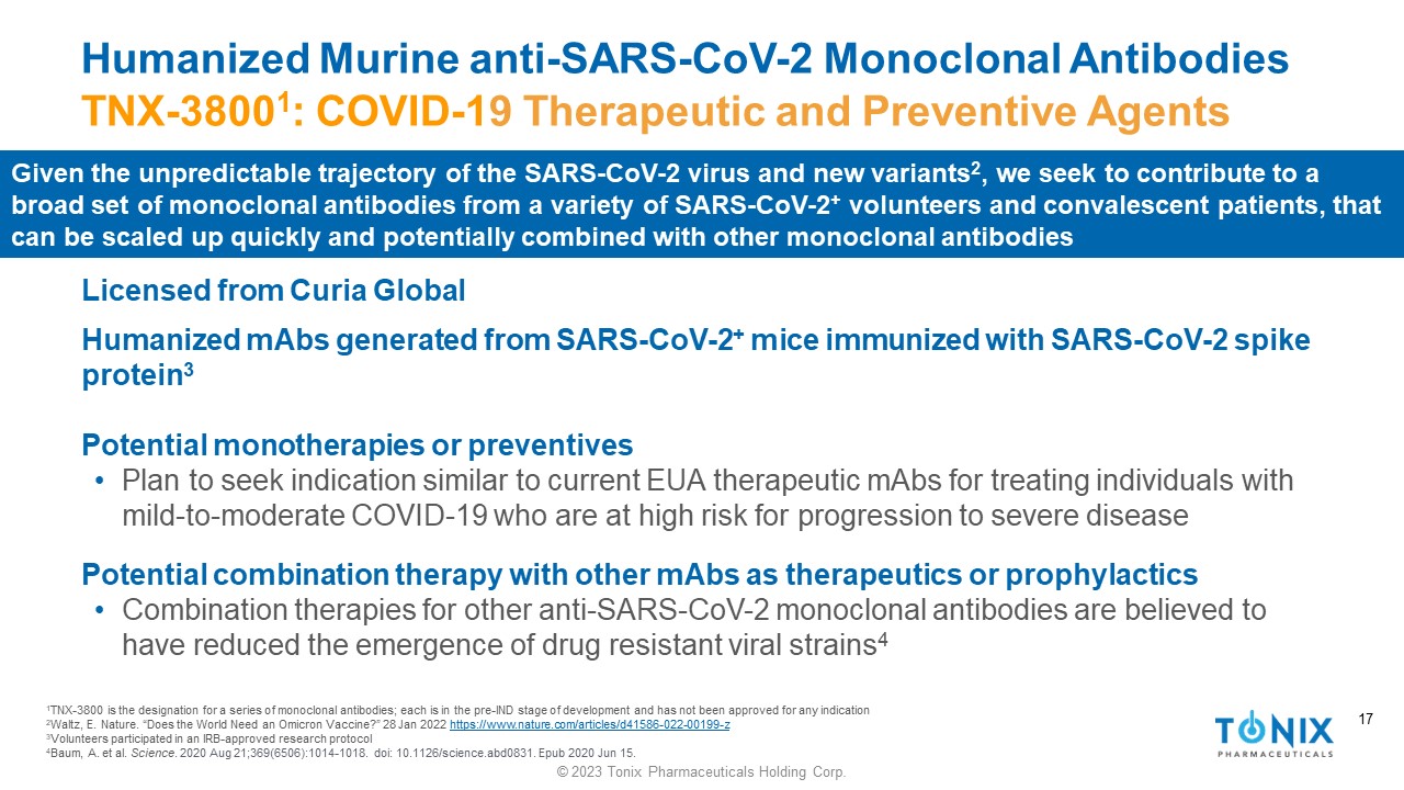 16 © 2023 Tonix Pharmaceuticals Holding Corp. 16 Comparing Development Platforms for Novel anti - SARS - CoV - 2 Monoclonal Antibodies 1 Vir isolated sotrovimab from the blood of a SARS - CoV - 1 patent 2 Regeneron used both convalescent patient cells and a humanized mouse platform: Hansen J et al. Science . 2020 Aug 21;369(6506):1010 - 1014. doi : 10.1126/science.abd0827 3 Lu R - M, Hwang Y - C, Liu IJ, et al. Development of therapeutic antibodies for the treatment of diseases. J Biomed Sci . 2020;27(1):1. doi:10.1186/s12929 - 019 - 0592 - z 4 TNX - 3600 and TNX - 3800 are the designations for a series of monoclonal antibodies; each is in the pre - IND stage of development an d has not been approved for any indication. Generating fully human mAbs starting from recovered patient blood samples has the potential to reduce the time required to create novel therapeutics in response to newly identified COVID - 19 variants, relative to generating murine mAbs followed by humanization TNX - 3800 4 Mouse hybridoma approach 3 TNX - 3600 4 Human COVID - 19 convalescent patient approach Collect, isolate, and select B - cells Generate hybridomas Screening Sequencing, cloning, and expression Scale - up and production Prepare antigen Induce immune response Humanization Identify COVID convalescent volunteer New variant of interest identified Most therapeutic and prophylactic mAbs have originated from COVID - convalescent patient blood 1,2