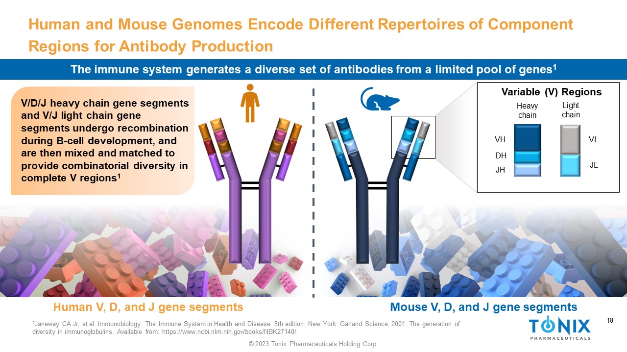 18 © 2023 Tonix Pharmaceuticals Holding Corp. 18 Human and Mouse Genomes Encode Different Repertoires of Component Regions for Antibody Production V/D/J heavy chain gene segments and V/J light chain gene segments undergo recombination during B - cell development, and are then mixed and matched to provide combinatorial diversity in complete V regions 1 1 Janeway CA Jr, et al. Immunobiology: The Immune System in Health and Disease. 5th edition. New York: Garland Science; 2001. T he generation of diversity in immunoglobulins. Available from: https://www.ncbi.nlm.nih.gov/books/NBK27140/ Variable (V) Regions Heavy chain Light chain VL JL VH JH DH Human V, D, and J gene segments Mouse V, D, and J gene segments The immune system generates a diverse set of antibodies from a limited pool of genes 1