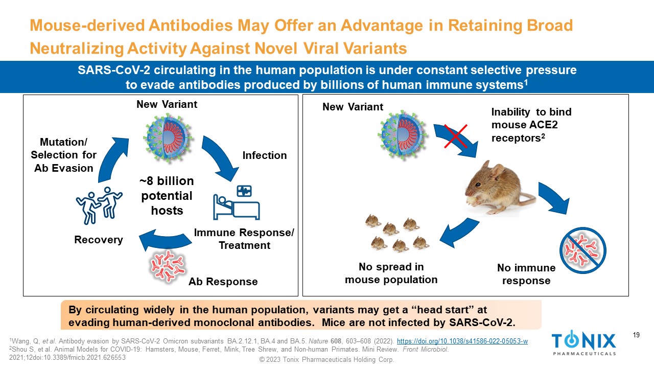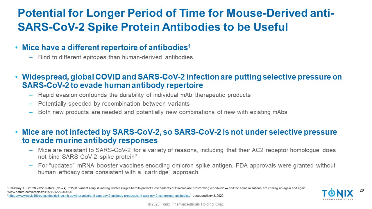 19 © 2023 Tonix Pharmaceuticals Holding Corp. 19 Mouse - derived Antibodies May Offer an Advantage in Retaining Broad Neutralizing Activity Against Novel Viral Variants SARS - CoV - 2 circulating in the human population is under constant selective pressure to evade antibodies produced by billions of human immune systems 1 New Variant Infection Immune Response/ Treatment Recovery Mutation/ Selection for Ab Evasion Ab Response New Variant Inability to bind mouse ACE2 receptors 2 No immune response ~8 billion potential hosts No spread in mouse population 1 Wang, Q, et al. Antibody evasion by SARS - CoV - 2 Omicron subvariants BA.2.12.1, BA.4 and BA.5. Nature 608 , 603 – 608 (2022). https://doi.org/10.1038/s41586 - 022 - 05053 - w 2 Shou S, et al. Animal Models for COVID - 19: Hamsters, Mouse, Ferret, Mink, Tree Shrew, and Non - human Primates. Mini Review. Front Microbiol . 2021;12doi:10.3389/fmicb.2021.626553 By circulating widely in the human population, variants may get a “head start” at evading human - derived monoclonal antibodies. Mice are not infected by SARS - CoV - 2.