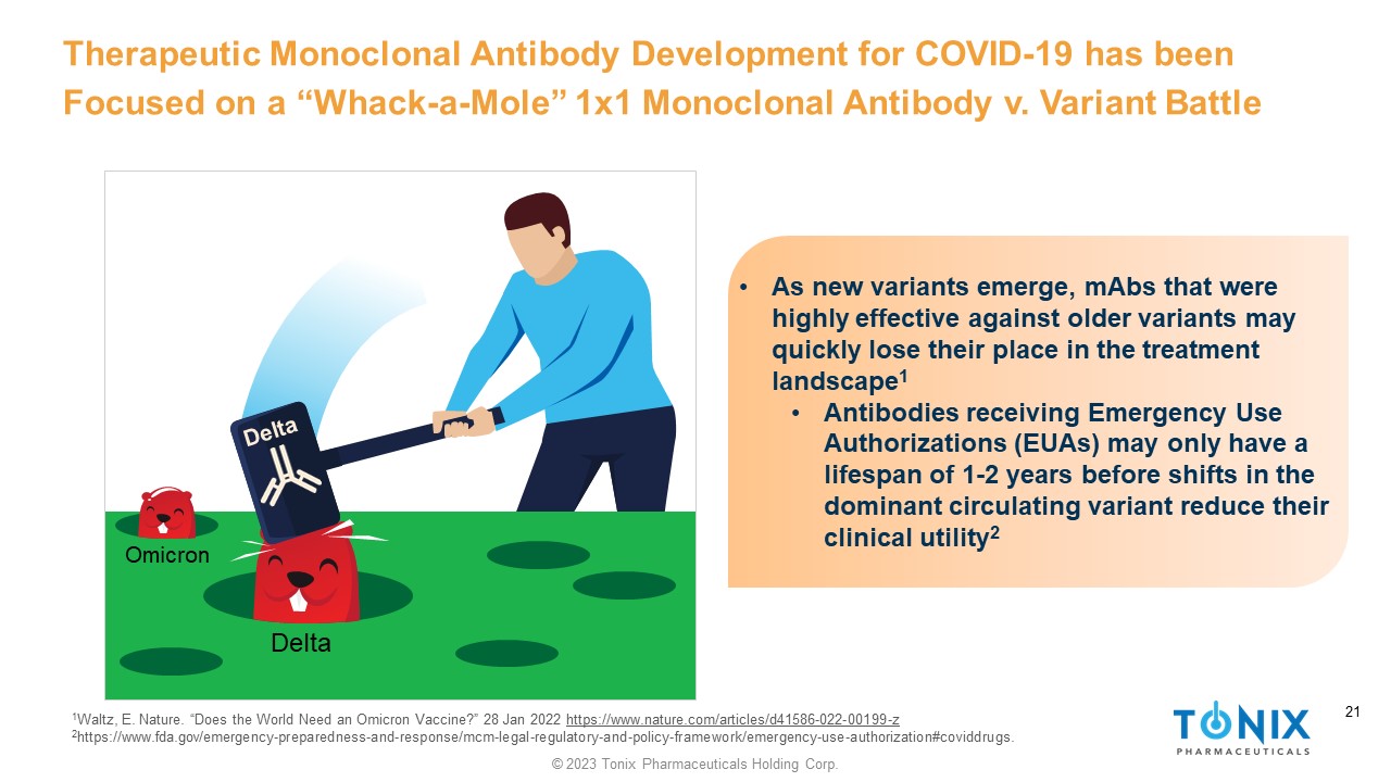 © 2023 Tonix Pharmaceuticals Holding Corp. 20 • Mice have a different repertoire of antibodies 1 ‒ Bind to different epitopes than human - derived antibodies • Widespread, global COVID and SARS - CoV - 2 infection are putting selective pressure on SARS - CoV - 2 to evade human antibody repertoire ‒ Rapid evasion confounds the durability of individual mAb therapeutic products ‒ Potentially speeded by recombination between variants ‒ Both new products are needed and potentially new combinations of new with existing mAbs • Mice are not infected by SARS - CoV - 2, so SARS - CoV - 2 is not under selective pressure to evade murine antibody responses ‒ Mice are resistant to SARS - CoV - 2 for a variety of reasons, including that their AC2 receptor homologue does not bind SARS - CoV - 2 spike protein 2 ‒ For “updated” mRNA booster vaccines encoding omicron spike antigen, FDA approvals were granted without human efficacy data consistent with a “cartridge” approach Potential for Longer Period of Time for Mouse - Derived anti - SARS - CoV - 2 Spike Protein Antibodies to be Useful 20 1 Callaway, E. Oct 28 2022. Nature (News). COVID ‘variant soup’ is making winter surges hard to predict: Descendants of Omicron are proliferating worldwide — and the same mutations are coming up again and again. www.nature.com/articles/d41586 - 022 - 03445 - 6 2 https://www.covid19treatmentguidelines.nih.gov/therapies/anti - sars - cov - 2 - antibody - products/anti - sars - cov - 2 - monoclonal - antibodies / - accessed Nov 3, 2022