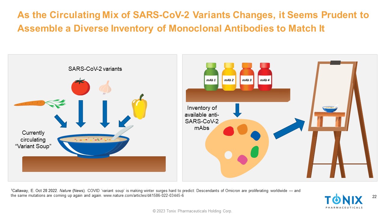 21 © 2023 Tonix Pharmaceuticals Holding Corp. 21 Therapeutic Monoclonal Antibody Development for COVID - 19 has been Focused on a “Whack - a - Mole” 1x1 Monoclonal Antibody v. Variant Battle Delta Omicron 1 Waltz, E. Nature. “Does the World Need an Omicron Vaccine?” 28 Jan 2022 https://www.nature.com/articles/d41586 - 022 - 00199 - z 2 https://www.fda.gov/emergency - preparedness - and - response/mcm - legal - regulatory - and - policy - framework/emergency - use - authorization#co viddrugs. • As new variants emerge, mAbs that were highly effective against older variants may quickly lose their place in the treatment landscape 1 • Antibodies receiving Emergency Use Authorizations (EUAs) may only have a lifespan of 1 - 2 years before shifts in the dominant circulating variant reduce their clinical utility 2