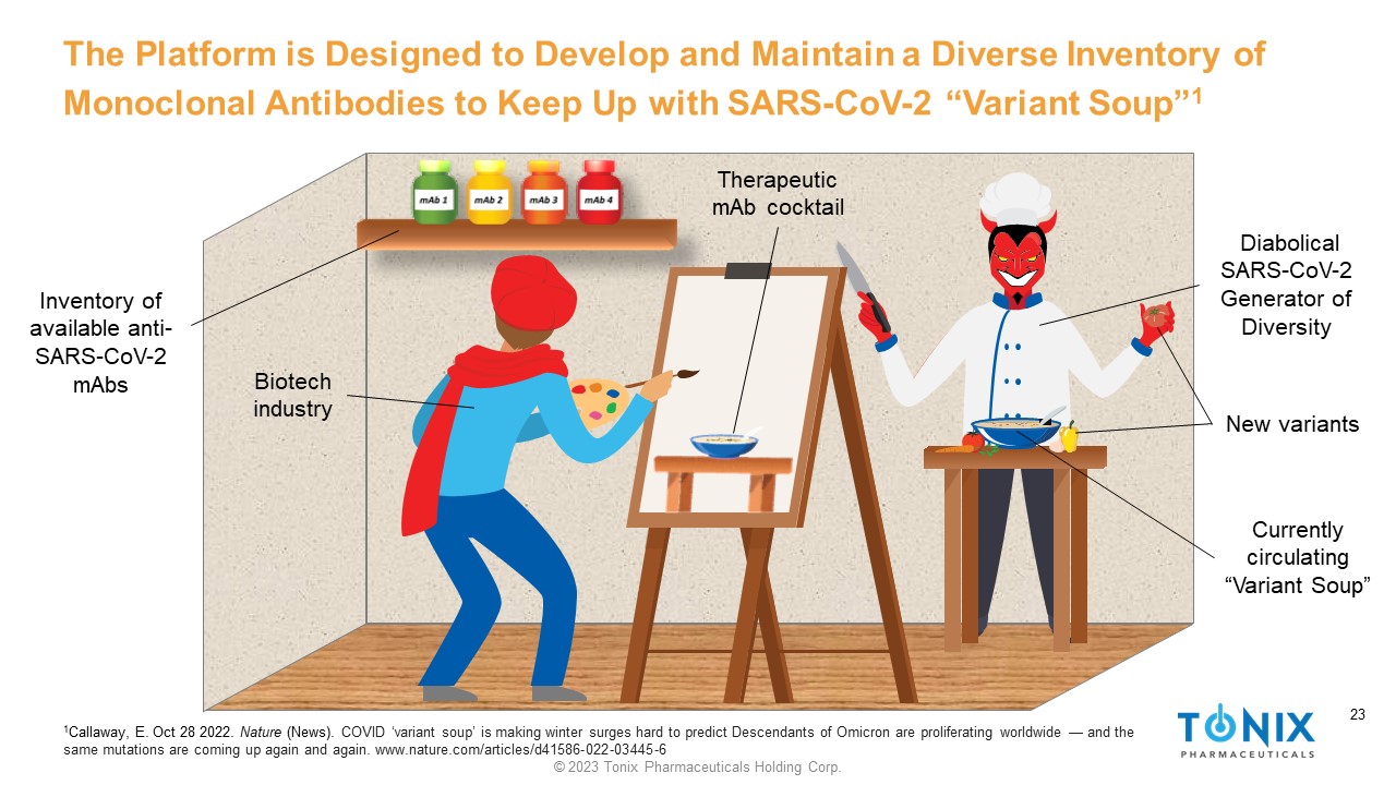 22 © 2023 Tonix Pharmaceuticals Holding Corp. 22 As the Circulating Mix of SARS - CoV - 2 Variants Changes, it Seems Prudent to Assemble a Diverse Inventory of Monoclonal Antibodies to Match It 1 Callaway, E. Oct 28 2022. Nature (News). COVID ‘variant soup’ is making winter surges hard to predict: Descendants of Omicron are proliferating worldwide — and the same mutations are coming up again and again. www.nature.com/articles/d41586 - 022 - 03445 - 6 Inventory of available anti - SARS - CoV - 2 mAbs Currently circulating “Variant Soup” SARS - CoV - 2 variants