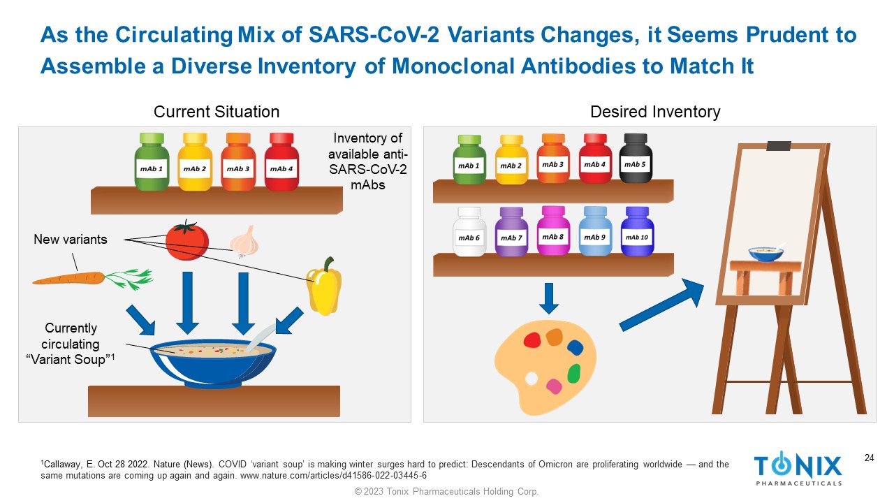 23 © 2023 Tonix Pharmaceuticals Holding Corp. 23 The Platform is Designed to Develop and Maintain a Diverse Inventory of Monoclonal Antibodies to Keep Up with SARS - CoV - 2 “Variant Soup” 1 Currently circulating “Variant Soup” New variants Biotech industry Inventory of available anti - SARS - CoV - 2 mAbs Diabolical SARS - CoV - 2 Generator of Diversity Therapeutic mAb cocktail 1 Callaway, E. Oct 28 2022. Nature (News). COVID ‘variant soup’ is making winter surges hard to predict Descendants of Omicron are proliferating worldwide — and the same mutations are coming up again and again. www.nature.com/articles/d41586 - 022 - 03445 - 6
