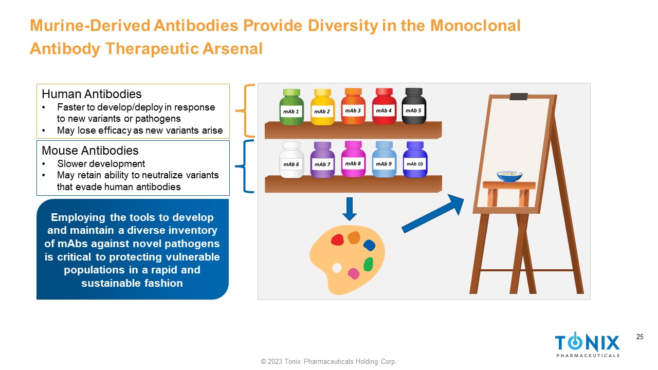 24 © 2023 Tonix Pharmaceuticals Holding Corp. 24 Desired Inventory Current Situation As the Circulating Mix of SARS - CoV - 2 Variants Changes, it Seems Prudent to Assemble a Diverse Inventory of Monoclonal Antibodies to Match It 1 Callaway, E. Oct 28 2022. Nature (News). COVID ‘variant soup’ is making winter surges hard to predict: Descendants of Omicron are proliferating worldwide — and the same mutations are coming up again and again. www.nature.com/articles/d41586 - 022 - 03445 - 6 Currently circulating “Variant Soup” 1 New variants Inventory of available anti - SARS - CoV - 2 mAbs