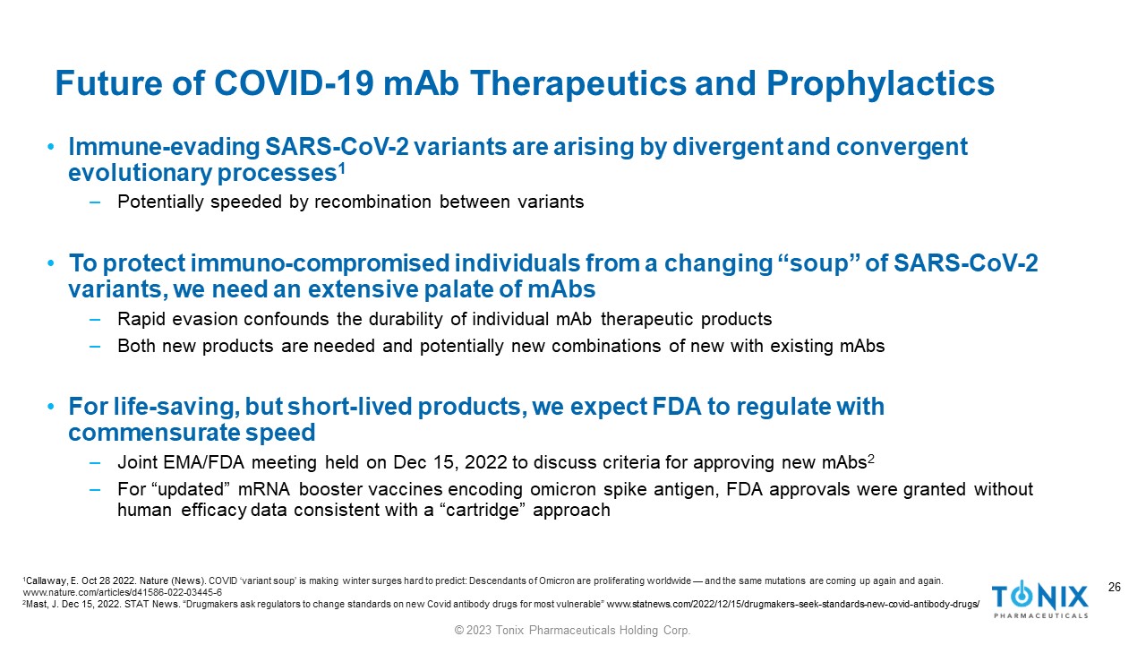 25 © 2023 Tonix Pharmaceuticals Holding Corp. 25 Murine - Derived Antibodies Provide Diversity in the Monoclonal Antibody Therapeutic Arsenal Human Antibodies • Faster to develop/deploy in response to new variants or pathogens • May lose efficacy as new variants arise Mouse Antibodies • Slower development • May retain ability to neutralize variants that evade human antibodies Employing the tools to develop and maintain a diverse inventory of mAbs against novel pathogens is critical to protecting vulnerable populations in a rapid and sustainable fashion