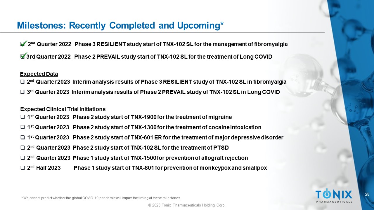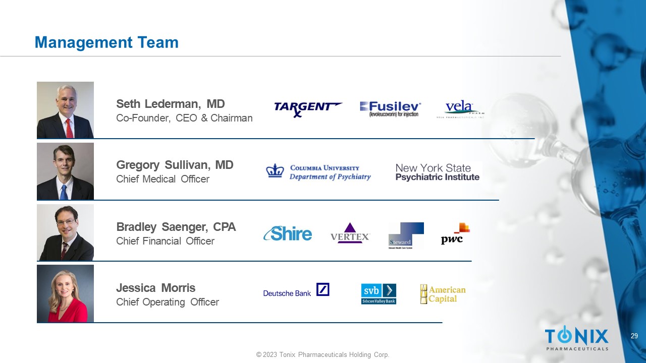 28 © 2023 Tonix Pharmaceuticals Holding Corp. Milestones: Recently Completed and Upcoming* Expected Clinical Trial Initiations □ 1 st Quarter 2023 Phase 2 study start of TNX - 1900 for the treatment of migraine □ 1 st Quarter 2023 Phase 2 study start of TNX - 1300 for the treatment of cocaine intoxication □ 1 st Quarter 2023 Phase 2 study start of TNX - 601 ER for the treatment of major depressive disorder □ 2 nd Quarter 2023 Phase 2 study start of TNX - 102 SL for the treatment of PTSD □ 2 nd Quarter 2023 Phase 1 study start of TNX - 1500 for prevention of allograft rejection □ 2 nd Half 2023 Phase 1 study start of TNX - 801 for prevention of monkeypox and smallpox * We cannot predict whether the global COVID - 19 pandemic will impact the timing of these milestones. □ 2 nd Quarter 2022 Phase 3 RESILIENT study start of TNX - 102 SL for the management of fibromyalgia □ 3rd Quarter 2022 Phase 2 PREVAIL study start of TNX - 102 SL for the treatment of Long COVID x x Expected Data □ 2 nd Quarter 2023 Interim analysis results of Phase 3 RESILIENT study of TNX - 102 SL in fibromyalgia □ 3 rd Quarter 2023 Interim analysis results of Phase 2 PREVAIL study of TNX - 102 SL in Long COVID