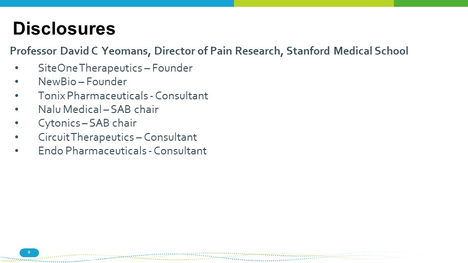 Disclosures 2 Professor David C Yeomans, Director of Pain Research, Stanford Medical School • SiteOne Therapeutics – Founder • NewBio – Founder • Tonix Pharmaceuticals - Consultant • Nalu Medical – SAB chair • Cytonics – SAB chair • Circuit Therapeutics – Consultant • Endo Pharmaceuticals - Consultant