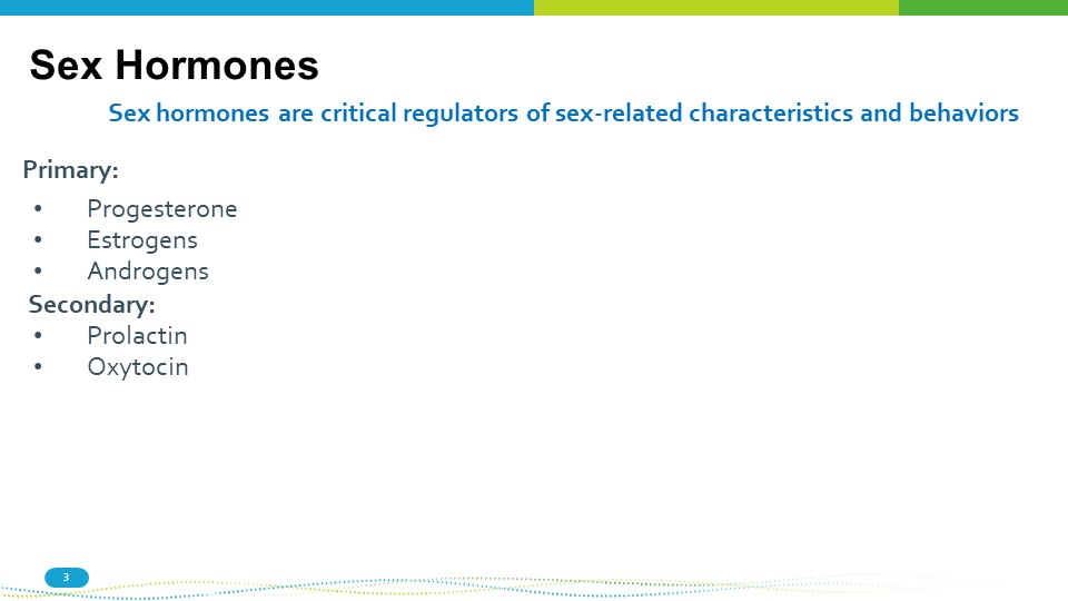 Sex Hormones 3 Sex hormones are critical regulators of sex - related characteristics and behaviors Primary: • Progesterone • Estrogens • Androgens Secondary: • Prolactin • Oxytocin