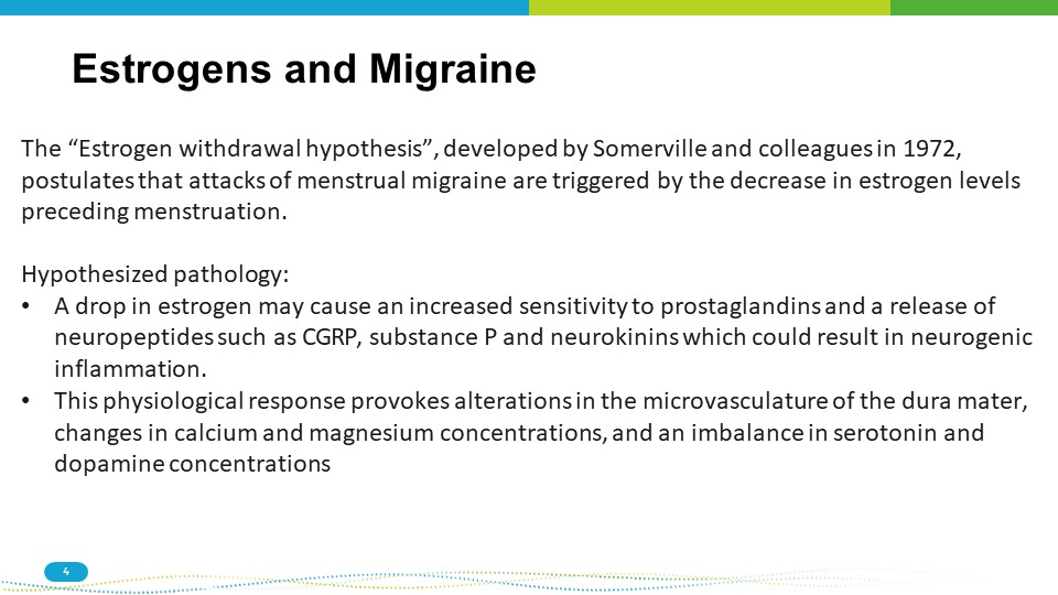The “Estrogen withdrawal hypothesis”, developed by Somerville and colleagues in 1972, postulates that attacks of menstrual migraine are triggered by the decrease in estrogen levels preceding menstruation. Hypothesized pathology: • A drop in estrogen may cause an increased sensitivity to prostaglandins and a release of neuropeptides such as CGRP, substance P and neurokinins which could result in neurogenic inflammation. • This physiological response provokes alterations in the microvasculature of the dura mater, changes in calcium and magnesium concentrations, and an imbalance in serotonin and dopamine concentrations 4 Estrogens and Migraine