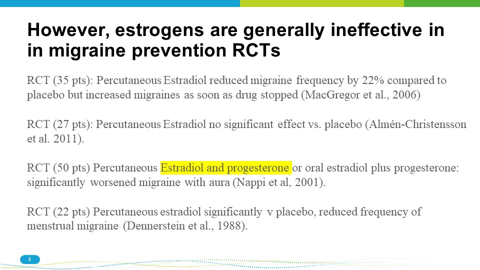 However, estrogens are generally ineffective in in migraine prevention RCTs 5 RCT (35 pts): Percutaneous Estradiol reduced migraine frequency by 22% compared to placebo but increased migraines as soon as drug stopped (MacGregor et al., 2006) RCT (27 pts): Percutaneous Estradiol no significant effect vs. placebo (Almén - Christensson et al. 2011). Estradiol and progesterone RCT (50 pts) Percutaneous or oral estradiol plus progesterone: significantly worsened migraine with aura (Nappi et al, 2001). RCT (22 pts) Percutaneous estradiol significantly v placebo, reduced frequency of menstrual migraine (Dennerstein et al., 1988).