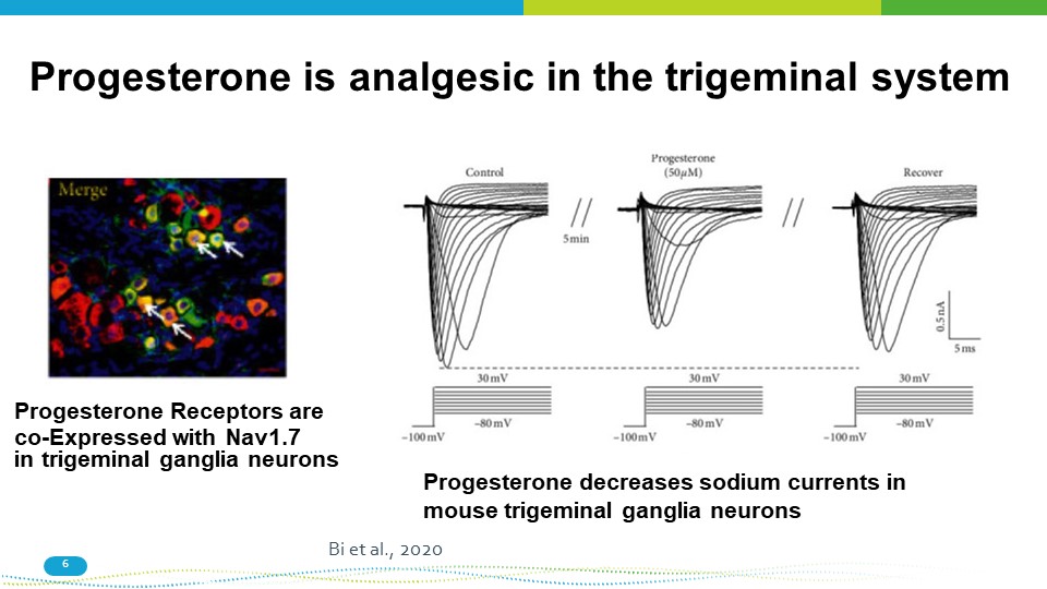 Progesterone is analgesic in the trigeminal system Progesterone Receptors are co - Expressed with Nav1.7 in trigeminal ganglia neurons Progesterone decreases sodium currents in mouse trigeminal ganglia neurons Bi et al., 2020 6