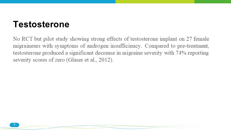 Testosterone 8 No RCT but pilot study showing strong effects of testosterone implant on 27 female migraineurs with symptoms of androgen insufficiency . Compared to pre - treatment, testosterone produced a significant decrease in migraine severity with 74 % reporting severity scores of zero (Glaser et al . , 2012 ) .