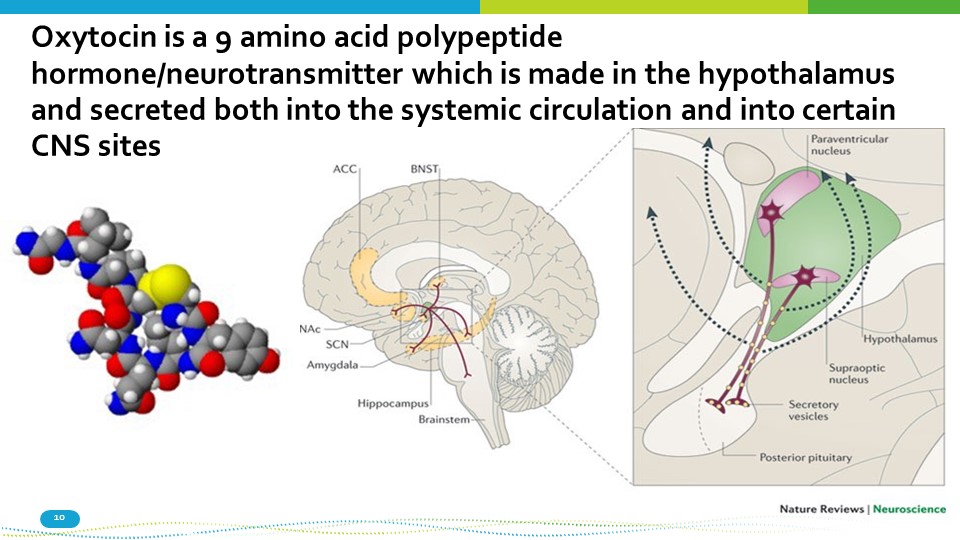 Oxytocin is a 9 amino acid polypeptide hormone/neurotransmitter which is made in the hypothalamus and secreted both into the systemic circulation and into certain CNS sites 10