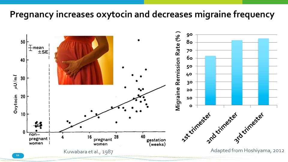 Pregnancy increases oxytocin and decreases migraine frequency 90 80 70 60 50 40 30 20 10 0 Migraine Remission Rate (% ) Adapted from Hoshiyama, 2012 Kuwabara et al., 1987 11