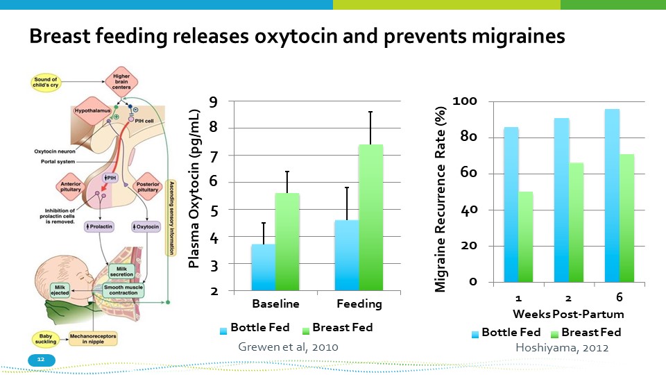 Breast feeding releases oxytocin and prevents migraines 9 8 7 6 5 4 3 2 Baseline Bottle Fed Feeding Breast Fed Plasma Oxytocin (pg/mL) 0 20 40 60 80 100 1 2 6 Weeks Post - Partum Migraine Recurrence Rate (%) Grewen et al, 2010 12 Bottle Fed Breast Fed Hoshiyama, 2012