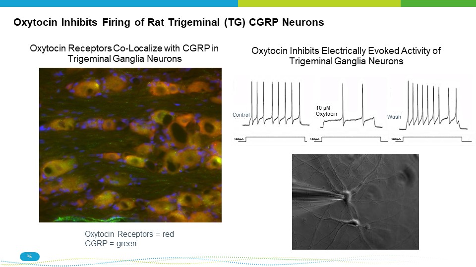 Oxytocin Inhibits Firing of Rat Trigeminal (TG) CGRP Neurons Oxytocin Receptors Co - Localize with CGRP in Trigeminal Ganglia Neurons Oxytocin Receptors = red CGRP = green Oxytocin Inhibits Electrically Evoked Activity of Trigeminal Ganglia Neurons 10 μM Oxytocin Control Wash 15