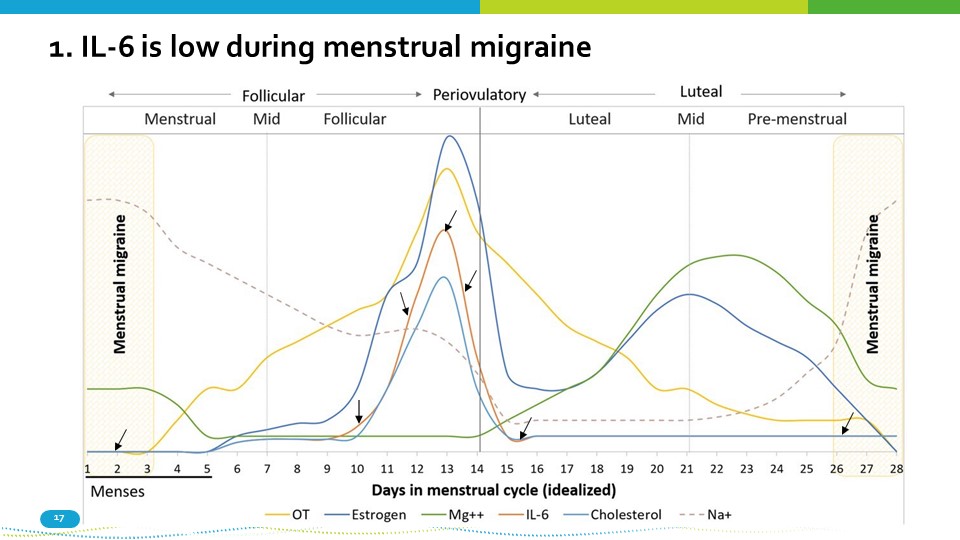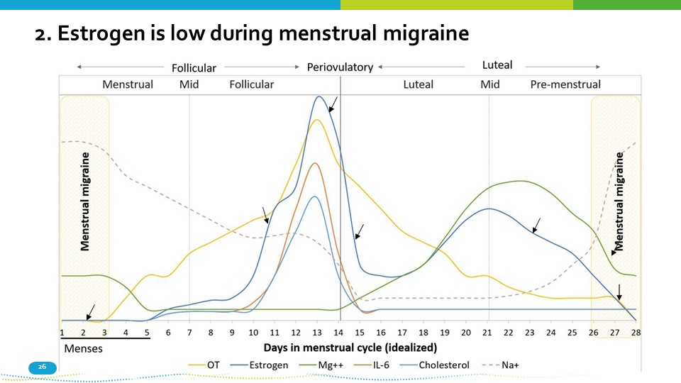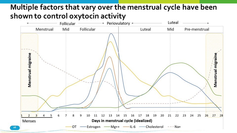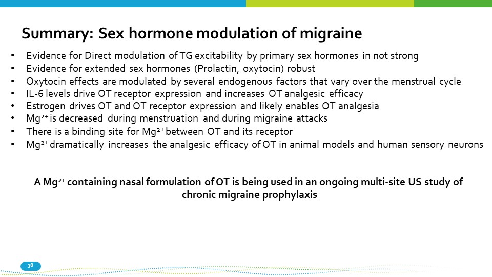 Summary: Sex hormone modulation of migraine 38 • Evidence for Direct modulation of TG excitability by primary sex hormones in not strong • Evidence for extended sex hormones (Prolactin, oxytocin) robust • Oxytocin effects are modulated by several endogenous factors that vary over the menstrual cycle • IL - 6 levels drive OT receptor expression and increases OT analgesic efficacy • Estrogen drives OT and OT receptor expression and likely enables OT analgesia • Mg 2+ is decreased during menstruation and during migraine attacks • There is a binding site for Mg 2+ between OT and its receptor • Mg 2+ dramatically increases the analgesic efficacy of OT in animal models and human sensory neurons A Mg 2+ containing nasal formulation of OT is being used in an ongoing multi - site US study of chronic migraine prophylaxis