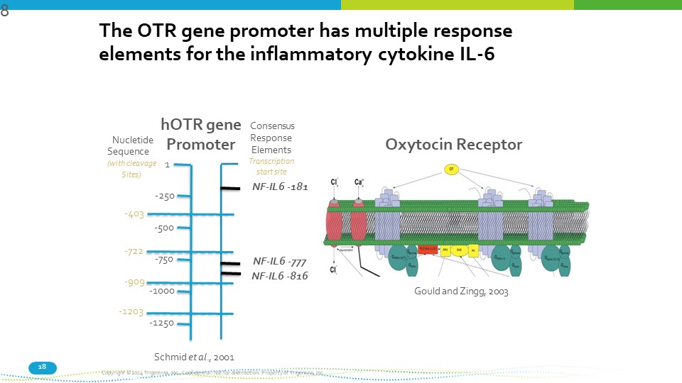 18 The OTR gene promoter has multiple response elements for the inflammatory cytokine IL - 6 Nucletide Sequence (with cleavage Sites) 1 - 250 - 750 - 1000 - 403 - 500 - 722 - 909 - 1203 - 1250 hOTR gene Promoter Consensus Response Elements Transcription start site NF - IL6 - 181 NF - IL6 - 777 NF - IL6 - 816 Oxytocin Receptor Schmid et al ., 2001 Copyright ©2014 Trigemina, Inc. Confidential: not for distribution. Property of Trigemina, Inc. Gould and Zingg, 2003 8