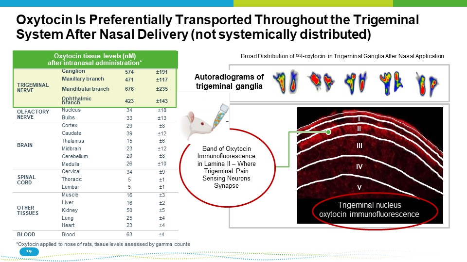 Trigeminal nucleus oxytocin immunofluorescence I II III IV V Autoradiograms of trigeminal ganglia Oxytocin Is Preferentially Transported Throughout the Trigeminal System After Nasal Delivery (not systemically distributed) Oxytocin tissue levels (nM) after intranasal administration* TRIGEMINAL NERVE Ganglion Maxillary branch Mandibular branch 574 471 676 “ 191 “ 117 “ 235 Ophthalmic branch 423 “ 143 OLFACTORY NERVE Nucleus Bulbs 34 33 “ 10 “ 13 BRAIN Cortex Caudate Thalamus Midbrain Cerebellum Medulla 29 39 15 23 20 26 “ 8 “ 12 “ 6 “ 12 “ 8 “ 10 SPINAL CORD Cervical Thoracic Lumbar 34 5 5 “ 9 “ 1 “ 1 OTHER TISSUES Muscle Liver Kidney Lung Heart 16 16 50 25 23 “ 3 “ 2 “ 5 “ 4 “ 4 BLOOD Blood 63 “ 4 *Oxytocin applied to nose of rats, tissue levels assessed by gamma counts Broad Distribution of 125 I - oxytocin in Trigeminal Ganglia After Nasal Application Band of Oxytocin Immunofluorescence in Lamina II – Where Trigeminal Pain Sensing Neurons Synapse 19